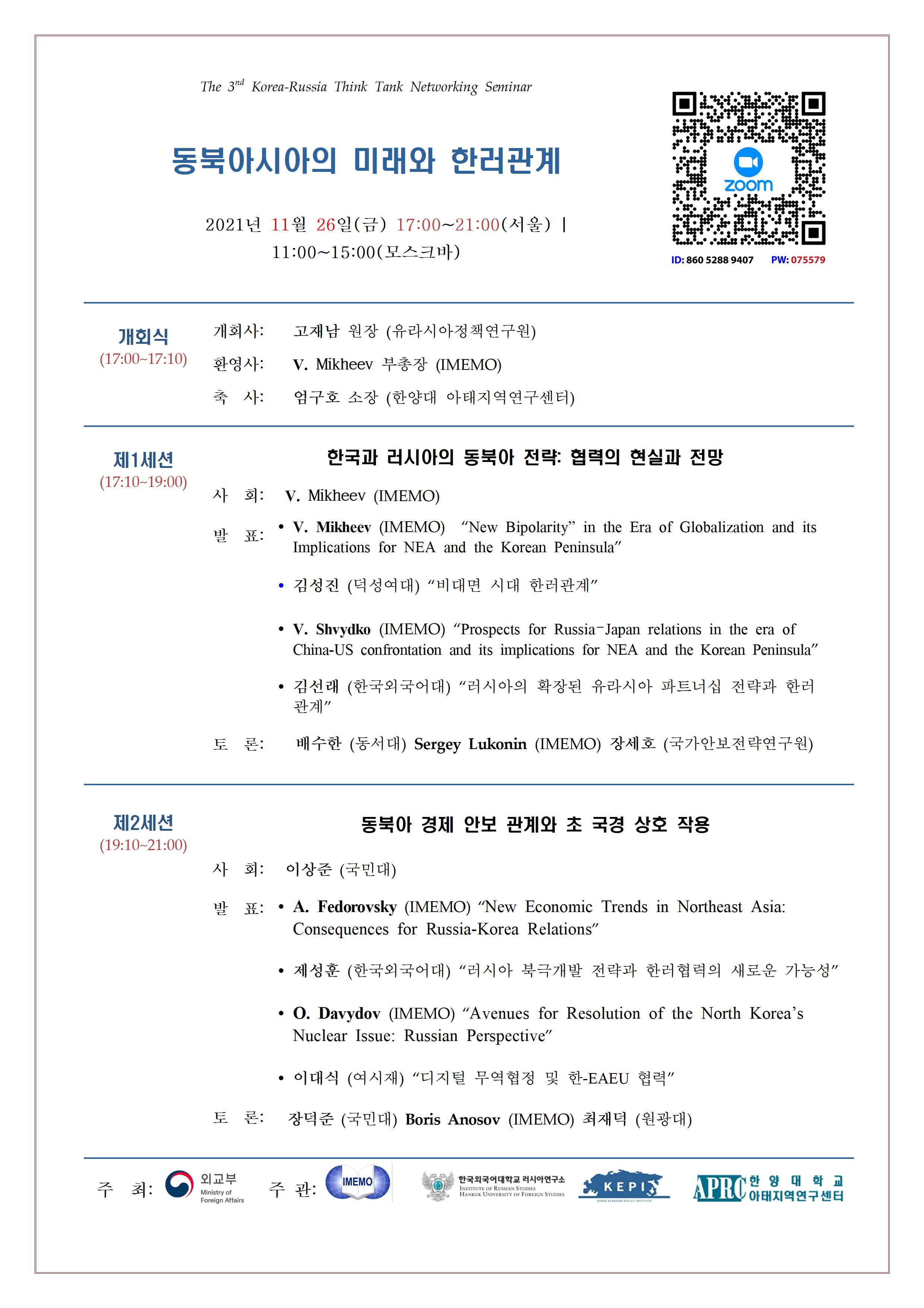 그 세번째 행사로 러시아 이메모 ( IMEMO)와  공동으로  ' 동북아시아의 미래와 한러관계 ' 라는 주제로 다음과 같이 세미나를 개최하오니 많은 관심과 참여 부탁드립니다 .