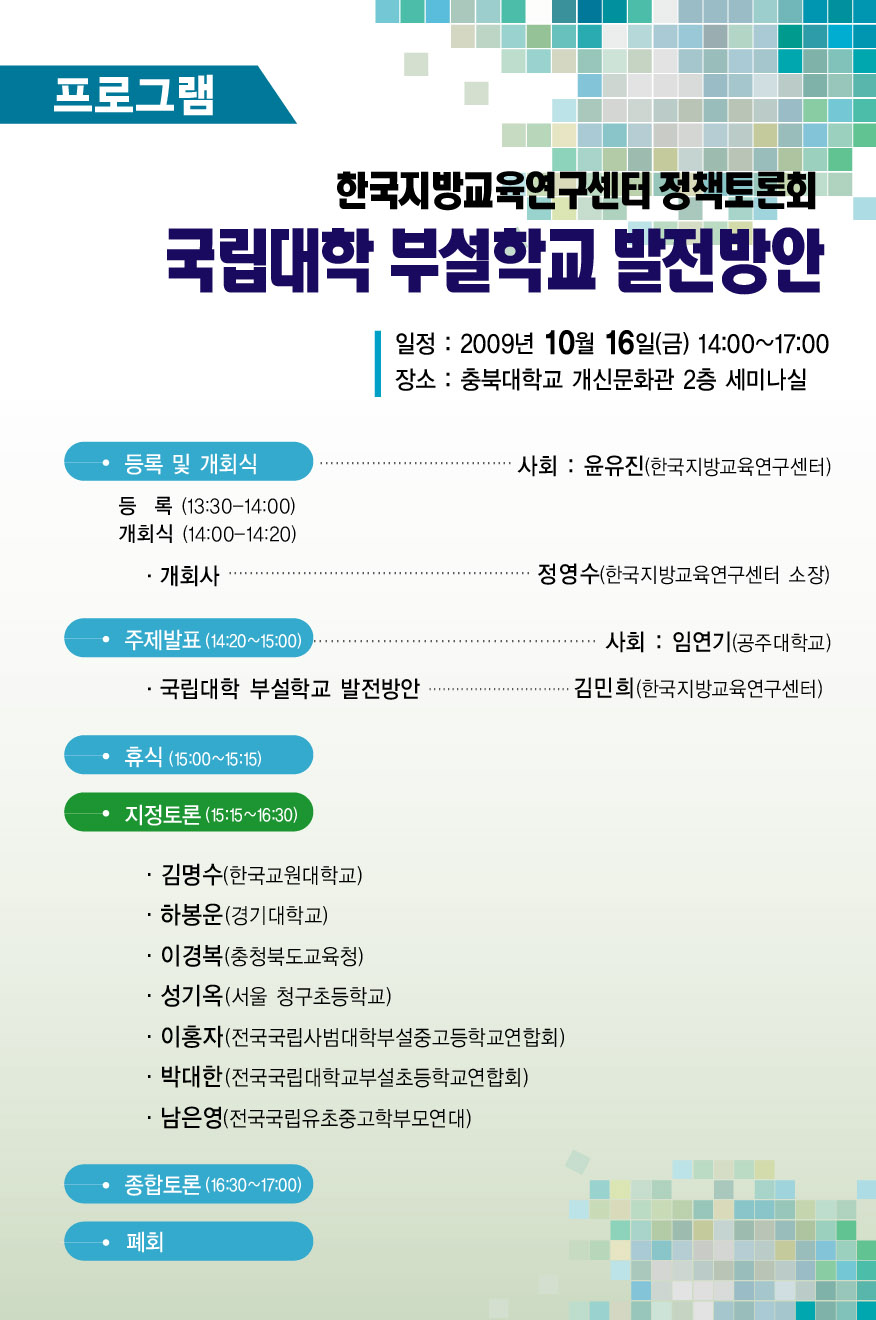 한국지방교육연구센터에서 '국립대학 부설학교 발전방안'이라는 주제로 정책 토론회를 개최한다고 합니다. 회원님들의 많은 관심과 참여 부탁드립니다. 일시: 2009년 10월 16일(금) 14:00~17:00 장소: 충북대학교 개신문화관 2층 세미나실 ====== 일정 ====== < 등록 및 개회식 > 개회사 ---------- 정영수(한국지방교육연구센터 소장) <주제발표> 국립대학 부설학교 발전방안 ---------- 김민희(한국지방교육연구센터) <휴식> <지정토론> 김명수(한국교원대학교) 하봉운(경기대학교) 이경복(충청북도교육청) 성기옥(서울 청구초등학교) 이홍자(전국국립사범대학부설중고등학교연합회) 박대한(전국국립대학교부설초등학교연합회) 남은영(전국국립유초중고학부모연대) <종합토론> <토론>