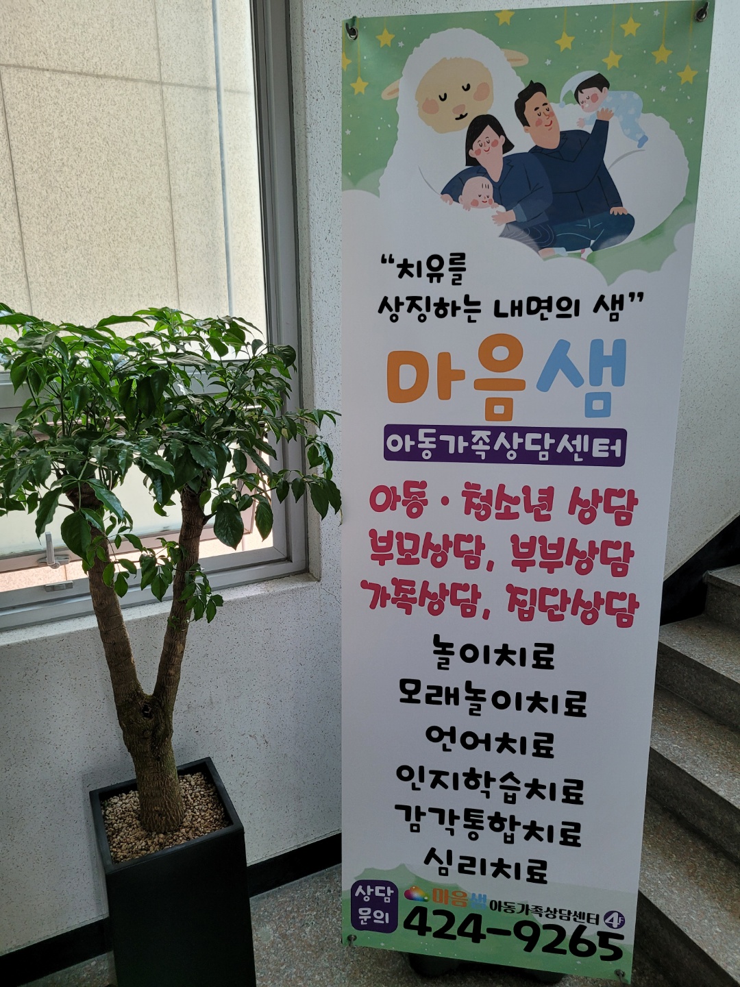 저희는 충남 아산 배방에 위치한 마음샘아동가족상담센터입니다.
