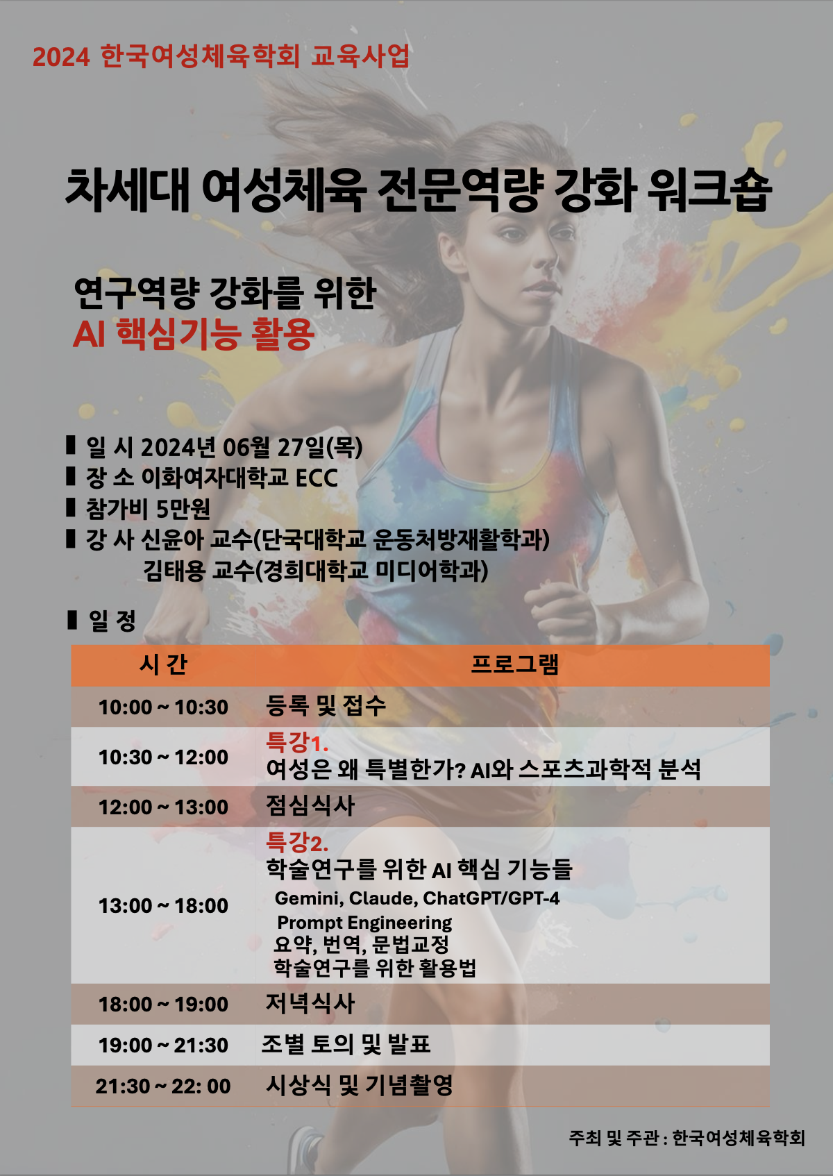 6월 27일 목요일에 한국여성체육학회 학문후속세대를 위한 워크숍을 진행할 예정입니다.