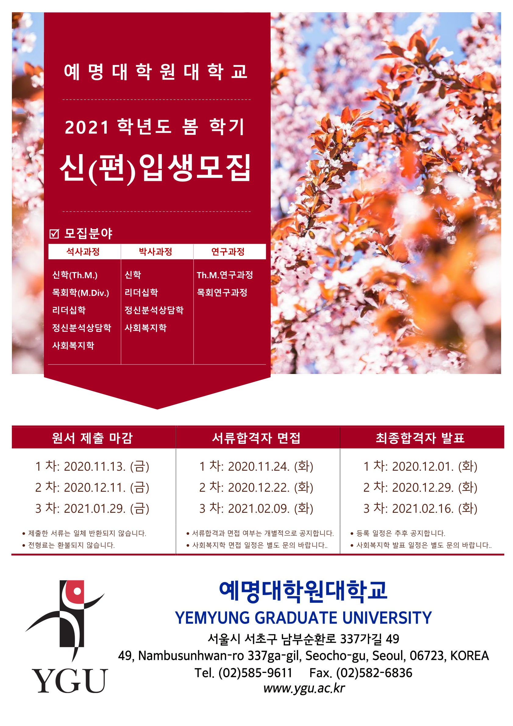 2021학년도 봄학기 예명대학원 대학교 신(편)입생을 모집합니다.