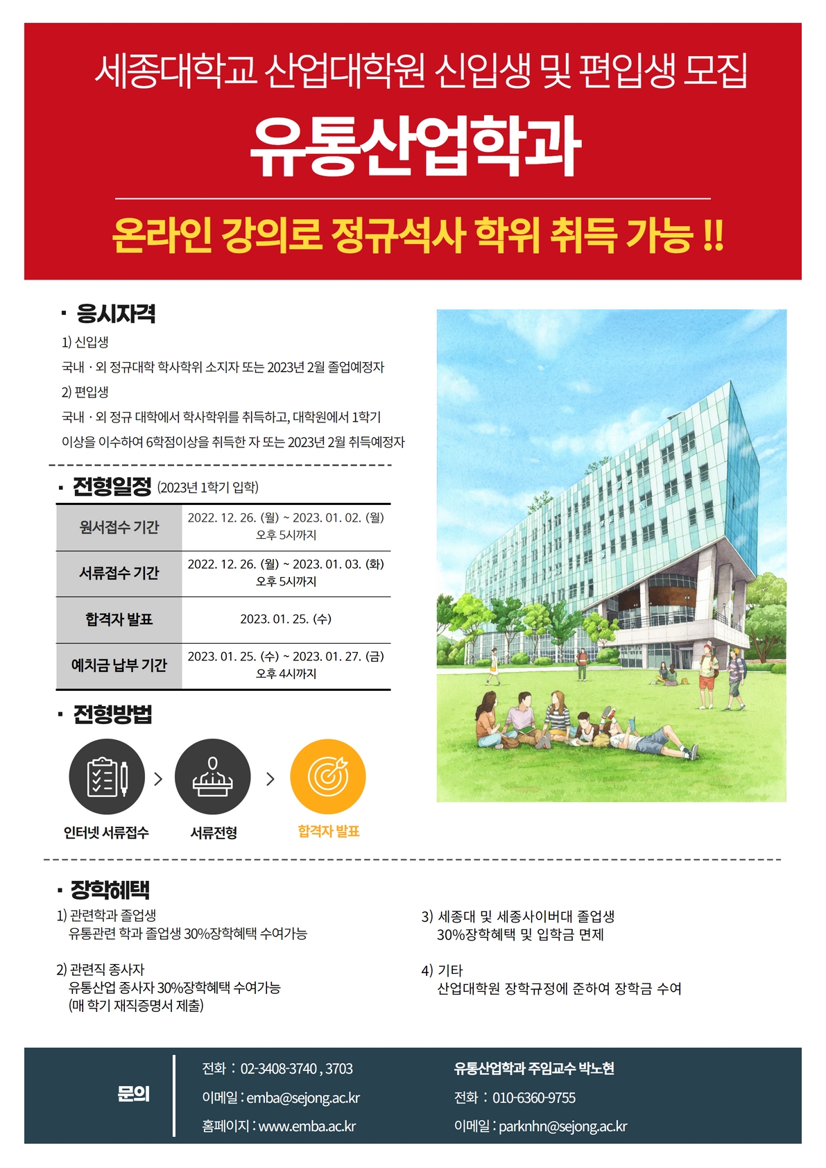 우리 학회의 회원이신 박노현 교수님이 재직하고 계시는 세종대학교 유통산업학과에서 편입생 모집하오니 많은 관심을 가져주시기 바랍니다.