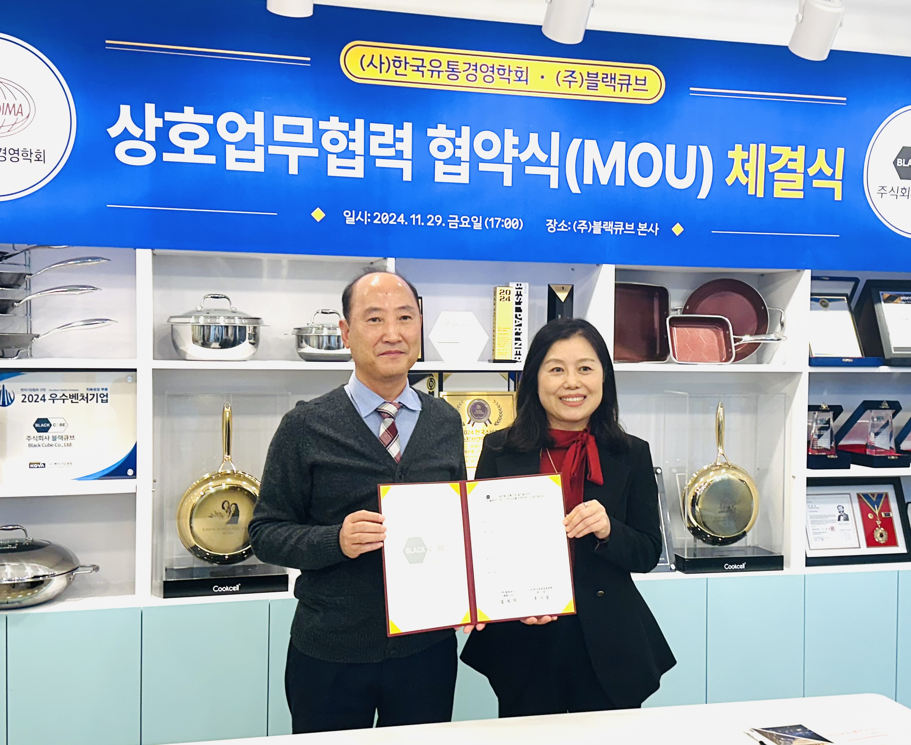 이번 행사는 혁신적인 코팅 기술과 차별적인 마케팅 전략으로 주방용품 우수 브랜드로 자리 매김 하면서 고도성장을 이루고 있는 (주)블랙큐브가 글로벌시장 진출을 위해 유통산업의 연구와 교육을 대표하는 (사)한국유통경영학회와 상호 간에 포괄적인 협력을 위한 MOU를 체결 했다.