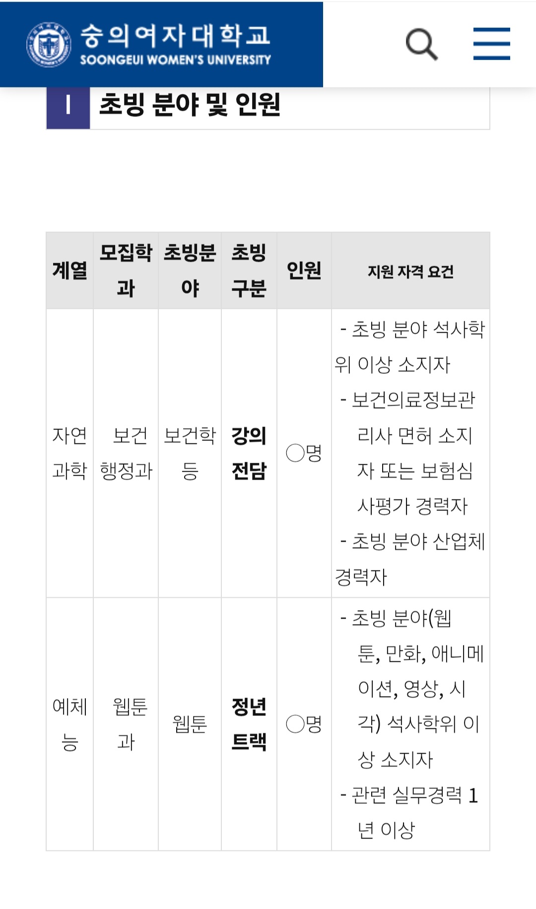숭의여자대학교 디자인학부에서는 2026학년도 신설되는 웹툰과의 정년트랙 전임교수를 초빙합니다.