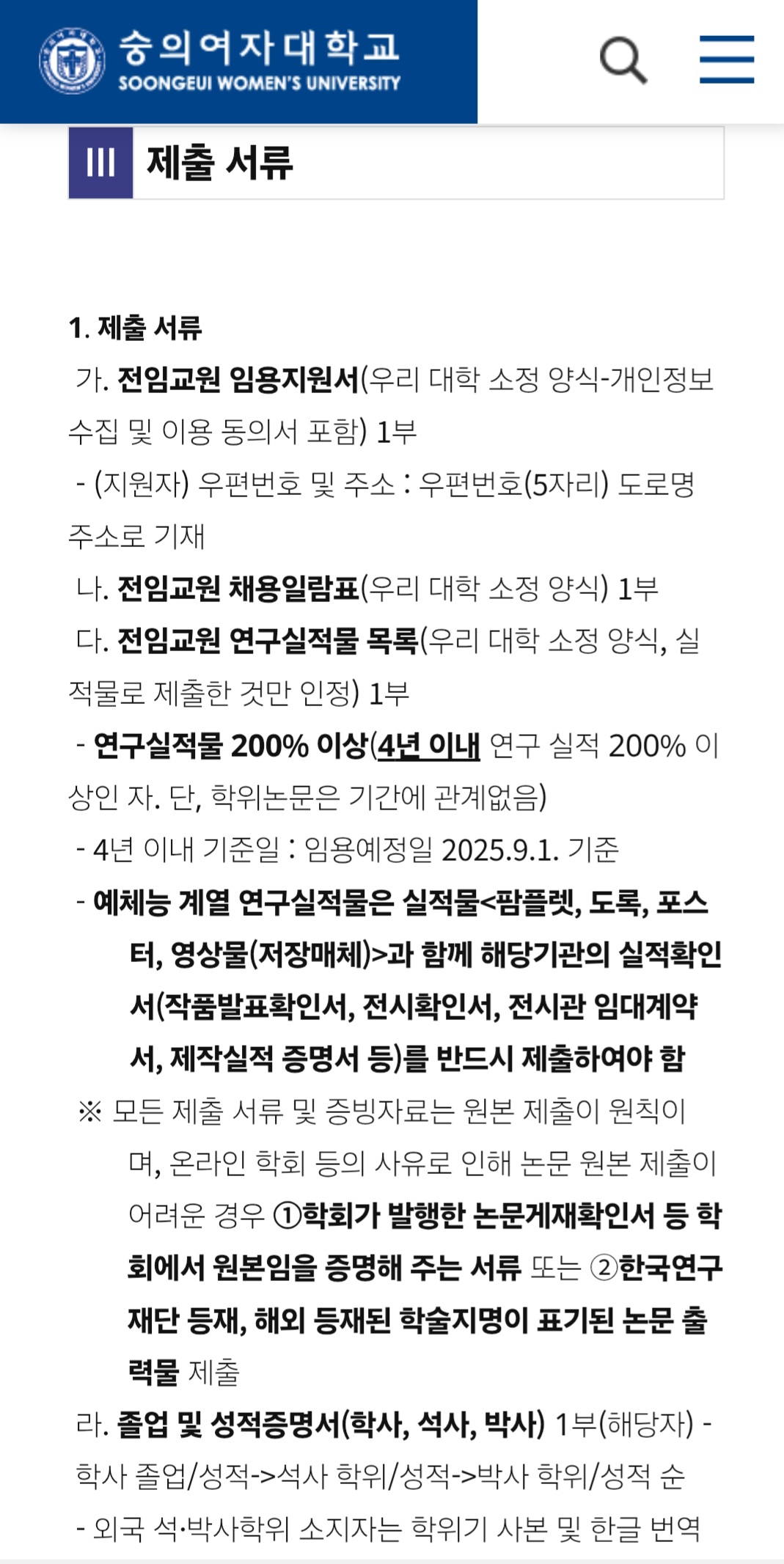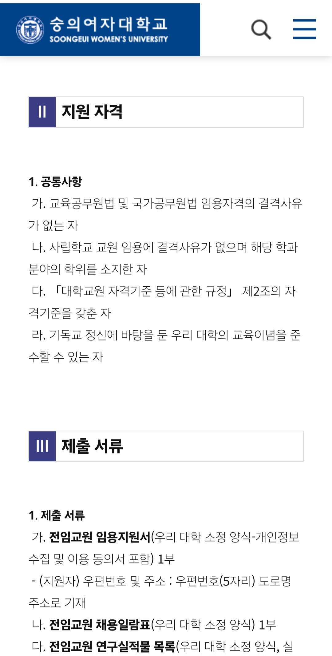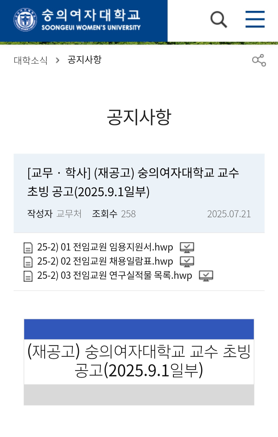 숭의여자대학교 채용공고 관련 공지사항:
