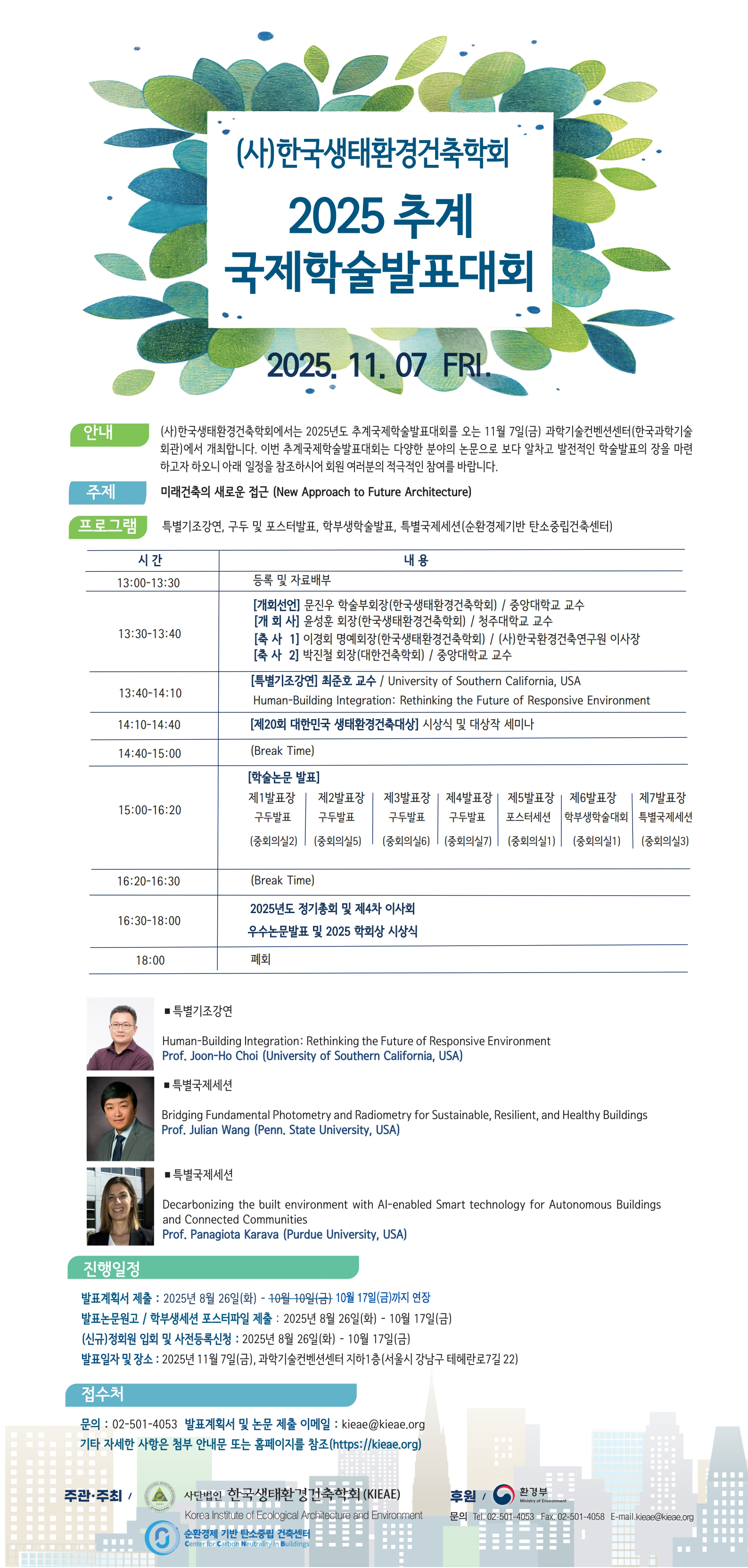 (사)한국생태환경건축학회에서는 2025년도 추계국제학술발표대회를 오는 11월 7일(금) 과학기술컨벤션센터(한국과학기술회관)에서 개최합니다.  이번 추계국제학술발표대회는 다양한 분야의 논문으로 보다 알차고 발전적인 학술발표의 장을 마련하고자 하오니 아래의 발표논문분야와 일정을 참고하시어 회원 여러분의 적극적인 참여를 부탁드립니다.