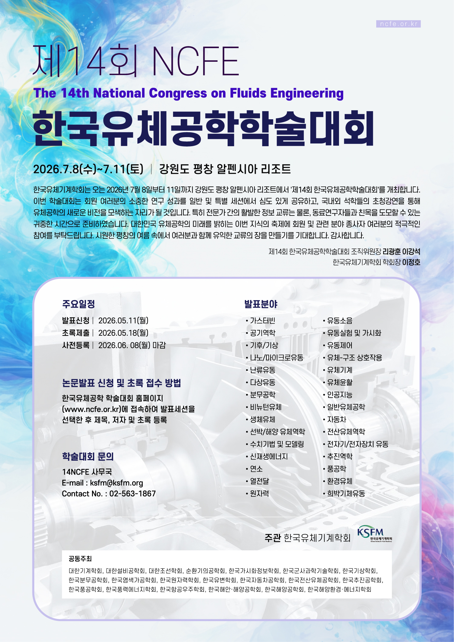 제14회 한국유체공학학술대회(The 14th National Congress on Fluids Engineering, 14NCFE)」는 2026년 7월 8일(수) ~ 11일(토), 강원도 평창 알펜시아 리조트에서 한국유체기계학회 주관으로 개최될 예정입니다.