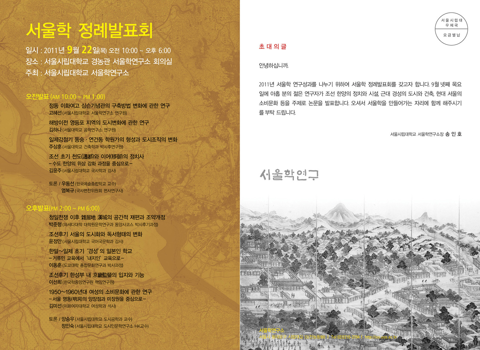2011년 서울학 연구성과를 나누기 위하여 서울학 정례발표회를 갖고자 합니다. 9월 넷째 목요일에 아홉 분의 젊은 연구자가 조선 한양의 정치와 시설, 근대 경성의 도시와 건축, 현대 서울의 소비문화 등을 주제로 논문을 발표합니다. 오셔서 서울학을 만들어가는 자리에 함께 해주시기를 부탁 드립니다