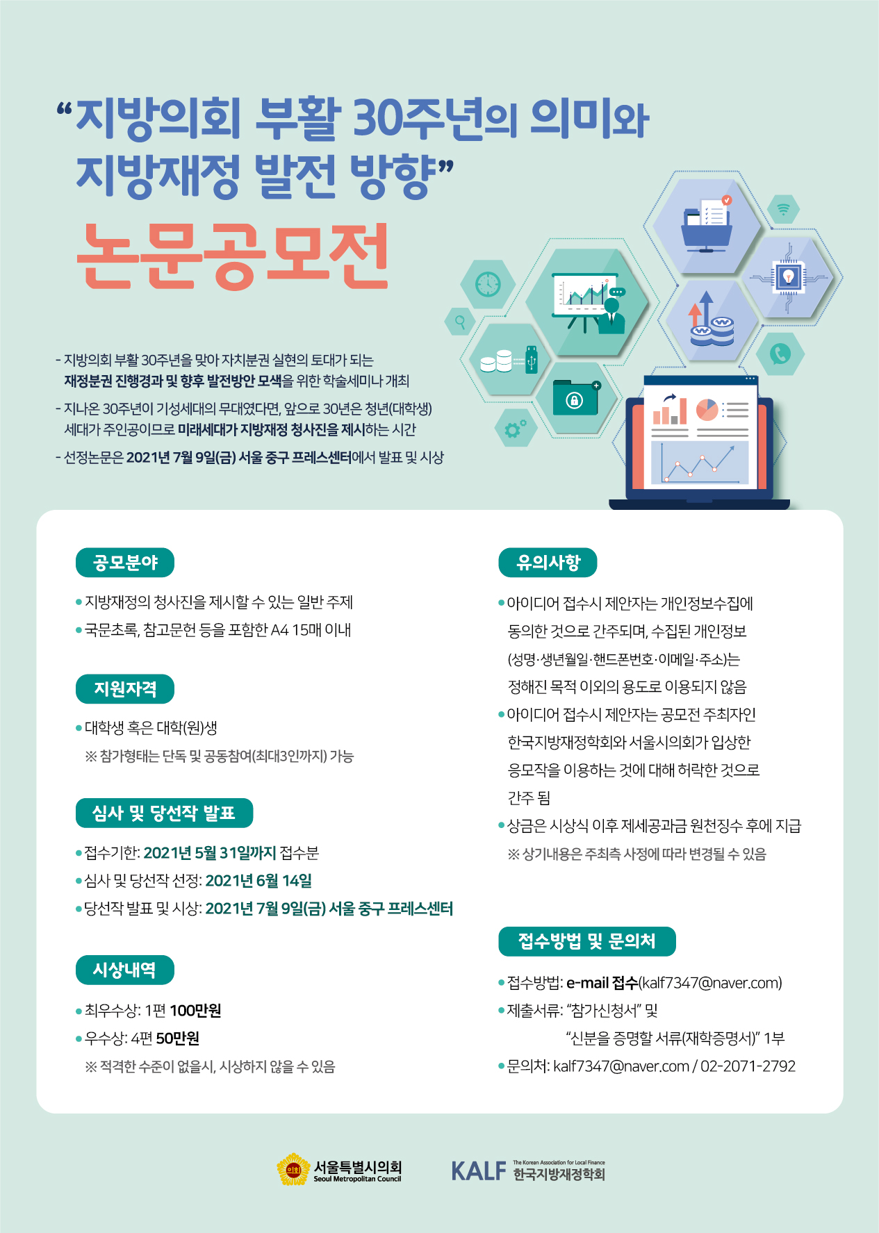 - 지방의회 부활 30주년을 맞아 자치분권 실현의 토대가 되는 재정분권 진행경과 및 향후 발전방안 모색을 위한 학술세미나 개최 - 지나온 30주년이 기성세대의 무대였다면, 앞으로 30년은 청년(대학생)세대가 주인공이므로 미래세대가 지방재정 청사진을 제시하는 시간 - 선정논문은 2021년 7월 9일(금) 서울 중구 프레스센터에서 발표 및 시상 |