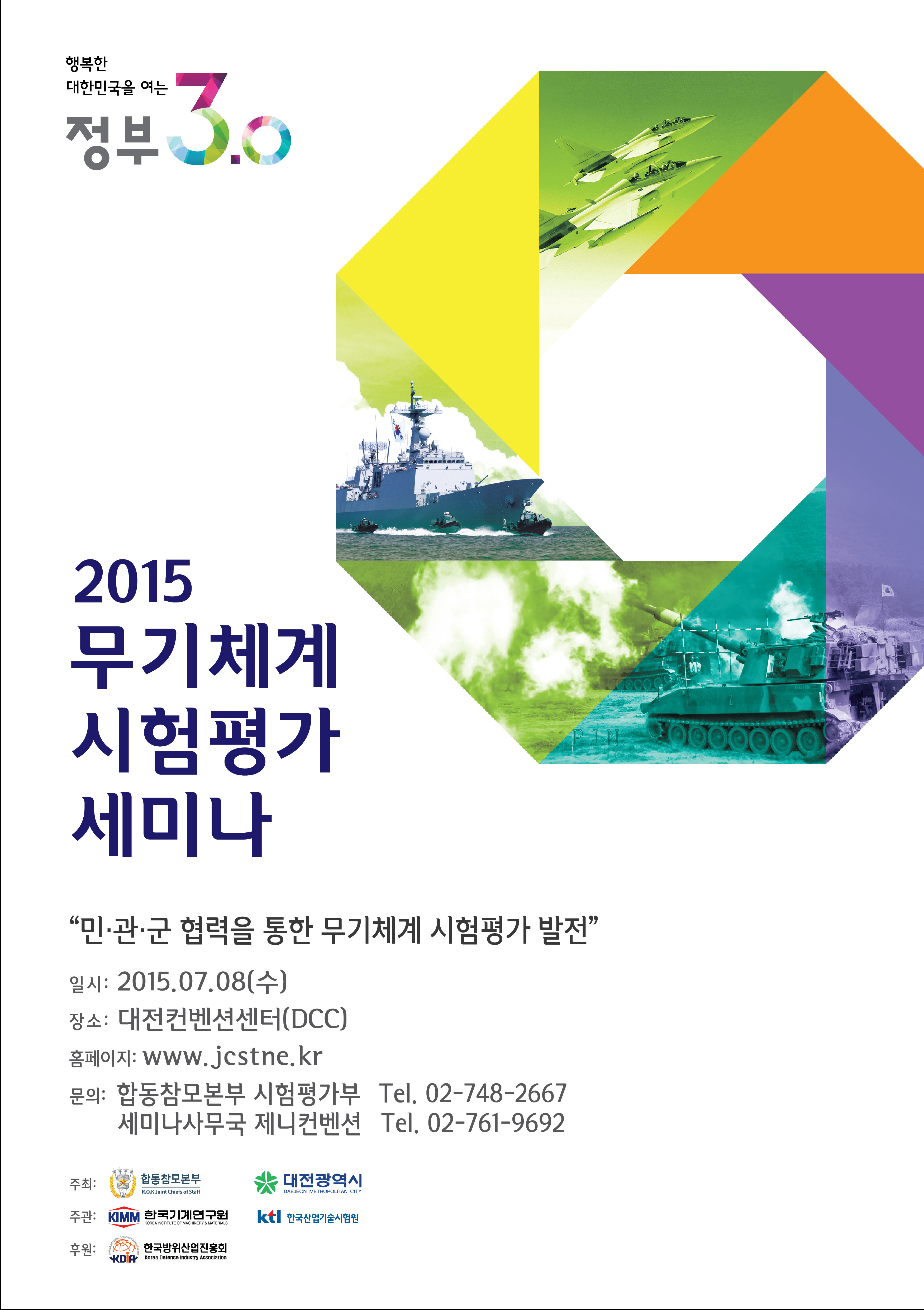 2015년 7월 8일 수요일, 대한민국 합동참모본부 주최로 대전컨벤션센터(DCC)에서 개최되는  [2015 무기체계 시험평가 세미나] 사무국에서 인사드립니다.