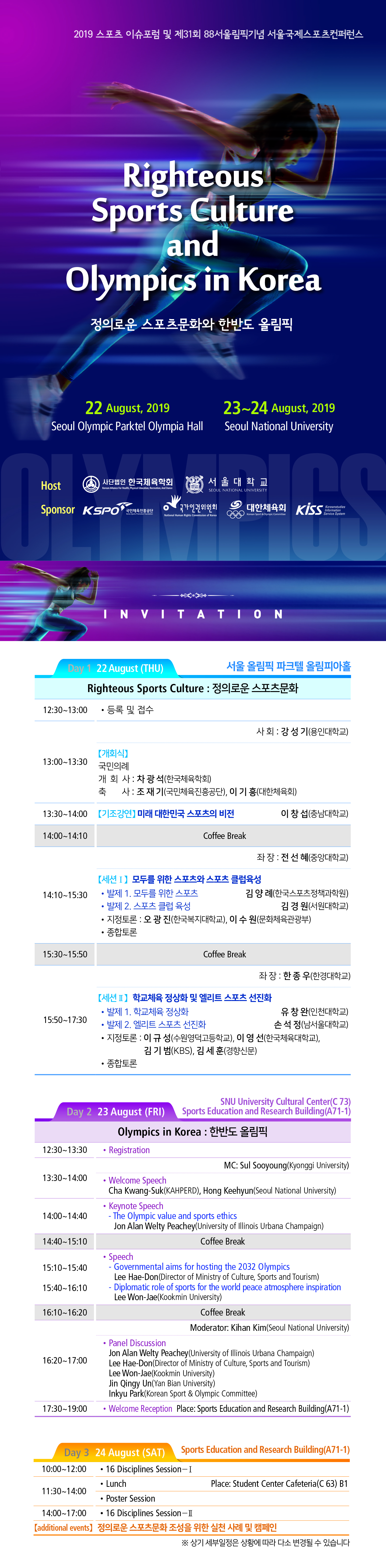[2019 체육인 결의대회 및 제31회 88서울올림픽기념 서울국제스포츠컨퍼런스개최와 관하여 행사명이 아래와 같이 변경되었음을 안내드립니다또한 첨부된 안내포스터를 통하여 일정을 참고하여 주시길 바랍니다.
