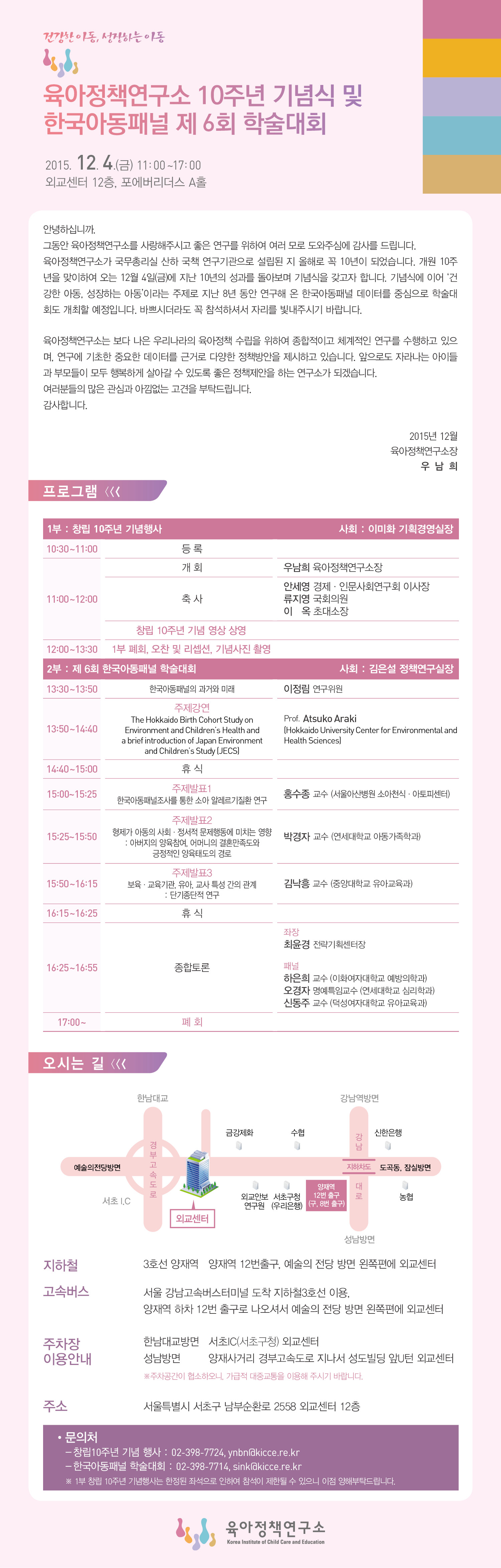 안녕하십니까? 국무총리 산하 국책 연구기관인 육아정책연구소의 한국아동패널 연구진입니다. 본 연구소에서는 오는 12월 4일(금)에 「육아정책연구소 10주년 기념식」과 더불어 「제6회 한국아동패널 학술대회」를 개최하고자 합니다. 이에 활발한 학술교류가 이루어질 수 있도록 귀 학회에 홍보를 부탁드리고자 합니다. 첨부해 드린 본 초청장을 기관 홈페이지에 게재해 주시고, 회원들에게 공지 메일을 발송해 주시 바랍니다. 다양한 연구 영역의 관련 학계 교수님과 전문가 분들의 많은 참여가 이루어질 수 있도록 관심과 협조를 부탁드립니다. 감사합니다. 한국아동패널 연구진 드림 * 별첨. 육아정책연구소 10주년 기념식 및 한국아동패널 제 6회 학술대회 초청장