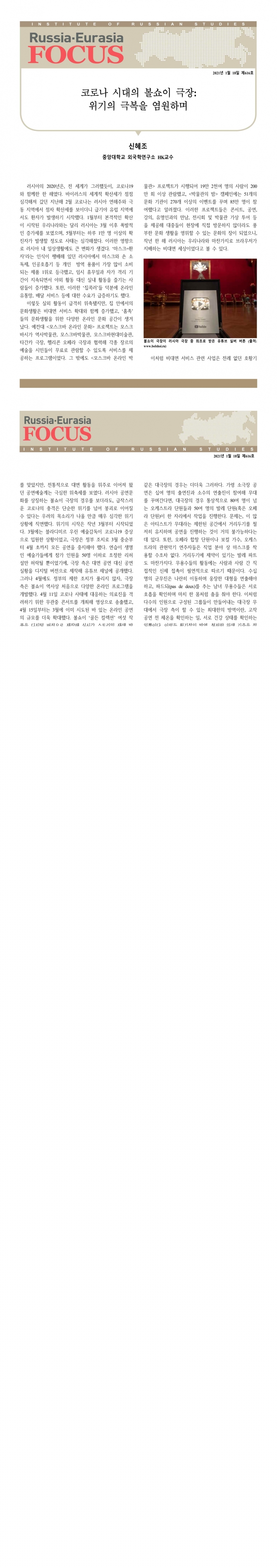 제616호 코로나 시대의 볼쇼이 극장: 위기의 극복을 염원하며