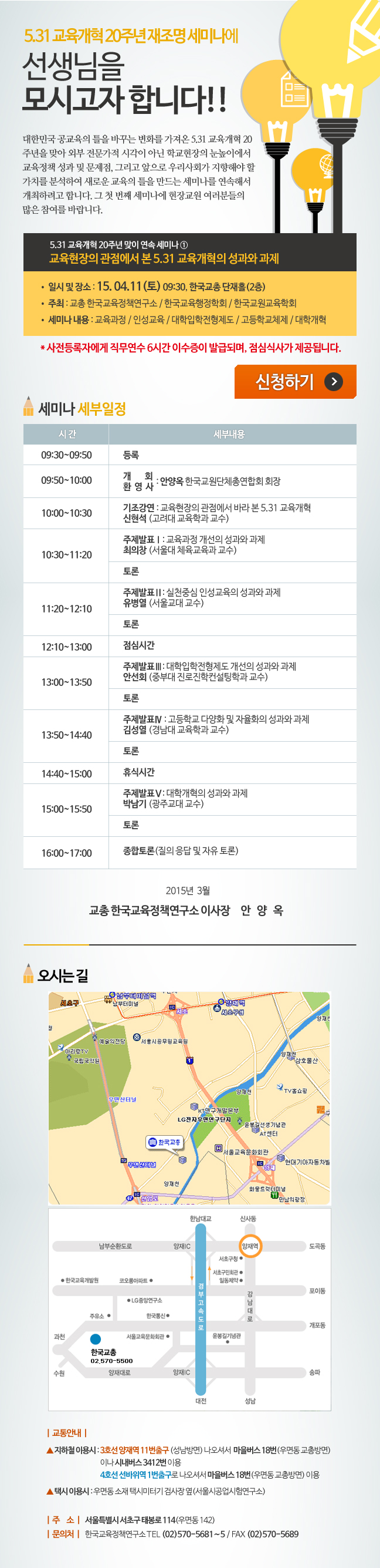 한국교육행정학회와 한국교육정책연구소에서 5.31교육개혁 20주년 재조명 세미나를 아래와 같이 개최합니다. 많은 관심 부탁드립니다. - 아래 - 일시: 2015년 4월 11일(토) 오전 09:30 장소: 한국교총 단재홀(2층) 주최 : 교총 한국교육정책연구소/ 한국교육행정학회/ 한국교원교육학회 세미나 내용 : 교육과정/ 인성교육/ 대학입학전형제도/ 고등학교체제/ 대학개혁 * 사전등록자에게 직무연수 6시간 이수증이 발급되며, 점심식사가 제공됩니다. -세미나 세부일정- 09:30~09:50 등록 09:50~10:00 개회 환 영 사 : 안양옥 (한국교원단체총연합회 회장) 10:00~10:30 기조강연 : 교육현장의 관점에서 바라 본 5.31 교육개혁 신현석(고려대학교 교수) 10:30~11:20 주제발표1 : 교육과정 개선의 성과와 과제 최의창(서울대학교 교수) 11:20~12:10 주제발표2 : 실천중심 인성교육의 성과와 과제 유병열(서울교육대학교 교수) 12:10~13:00 점심시간 13:00~13:50 주제발표3 : 대학입학전형제도 개선의 성과와 과제 안선회(중부대학교 교수) 13:50~14:40 주제발표4 : 고등학교 다양화 및 자율화의 성과와 과제 김성열(경남대학교 교수) 14:40~15:00 휴식 15:00~15:50 주제발표5 : 대학개혁의 성과와 과제 박남기(광주교육대학교 교수) 16:00~17:00 종합토론 주소 : 서울특별시 서초구 태봉로 114(우면동 142) 지하철 3호선 양재역 11번 출구(성남방면) 나오셔서 마을버스 18번(우면동 교총방면)이나 시내버스 3412번 이용 지하철 4호선 선바위역 1번출구로 나오셔서 마을버스 18번(우면동 교총방면) 이용 택시 이용시: 우면동 소재 택시미터기 검사장 옆(서울시공업시험연구소) 문의 : 한국교육정책연구소 (02-570-5681~5)