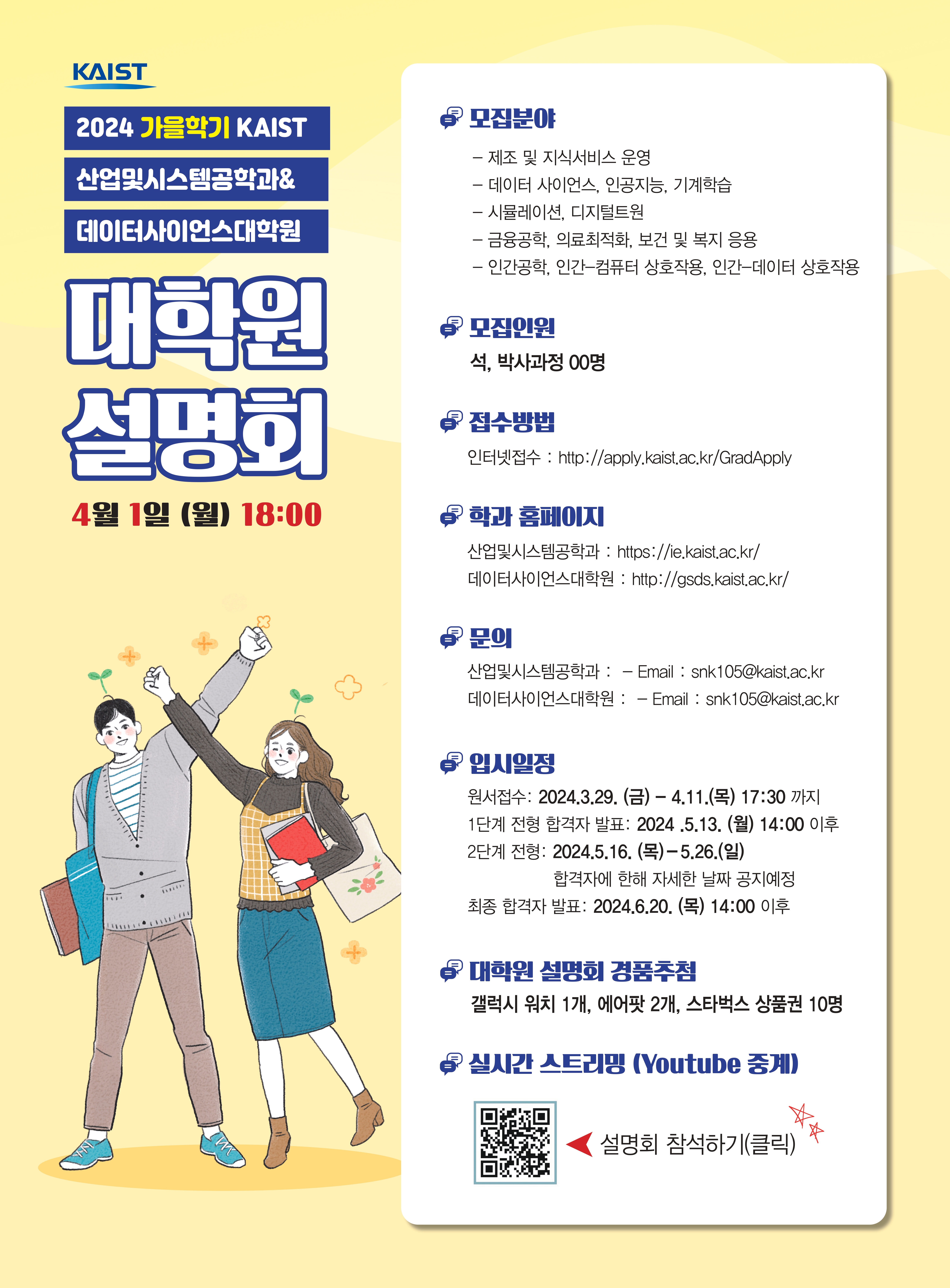 [카이스트] 2024 KAIST 가을학기 산업및시스템공학과&데이터사이언스 대학원 가을학기 입시 설명회