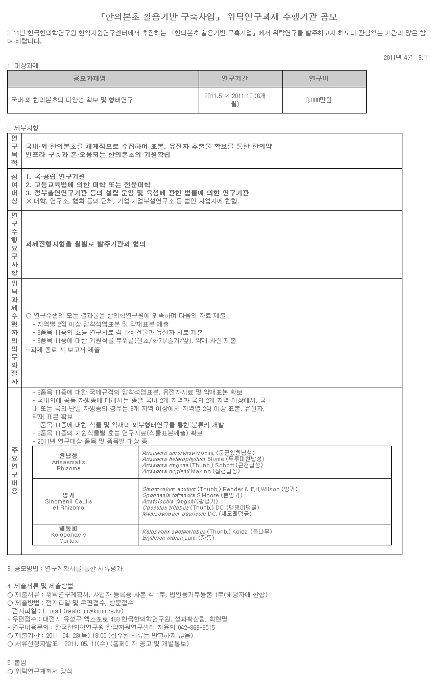 2011년 한국한의학 연구원 한약자원연구센터에서 추진하는 '한의본초 활용기반 구축사업' 에서 위탁연구를 발주하고자 하오니 관심있는 회원님들께서는 참여바랍니다.