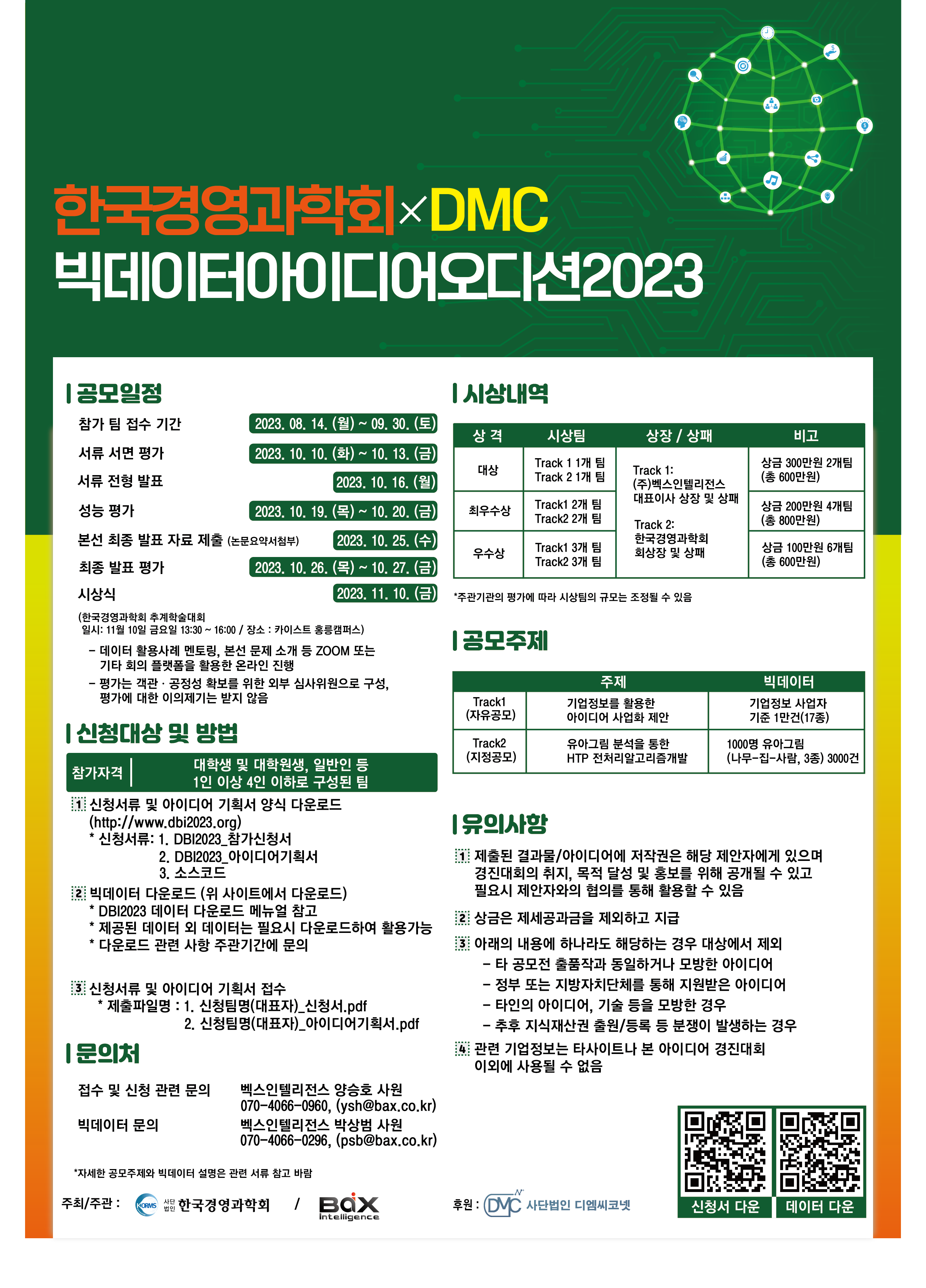 한국경영과학회 및 ㈜벡스인텔리전스에서 주최/주관하고, (사)디엠씨코넷에서 후원하여 빅데이터를 이용한 알고리즘 고도화 및 창의적인 아이디어 발굴을 위해 『2023년 DMC 빅데이터 아이디어 오디션』을 개최합니다. 창의적인 아이디어 및 도전 정신을 가진 여러분의 많은 관심과 참여를 바랍니다.