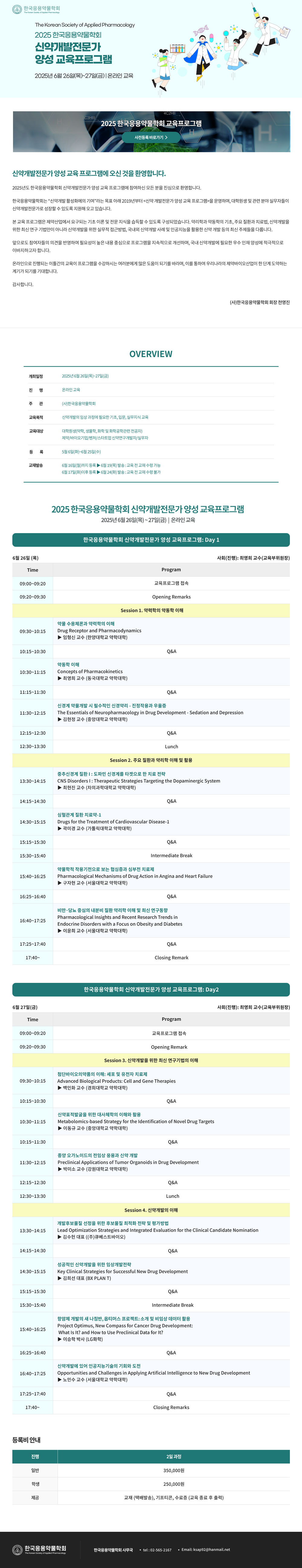 * 교육 대상: 대학원생(약학, 생물학, 화학 및 화학공학관련 전공자), 제약/바이오기업/벤처/스타트업 신약연구개발자/실무자교육프로그램