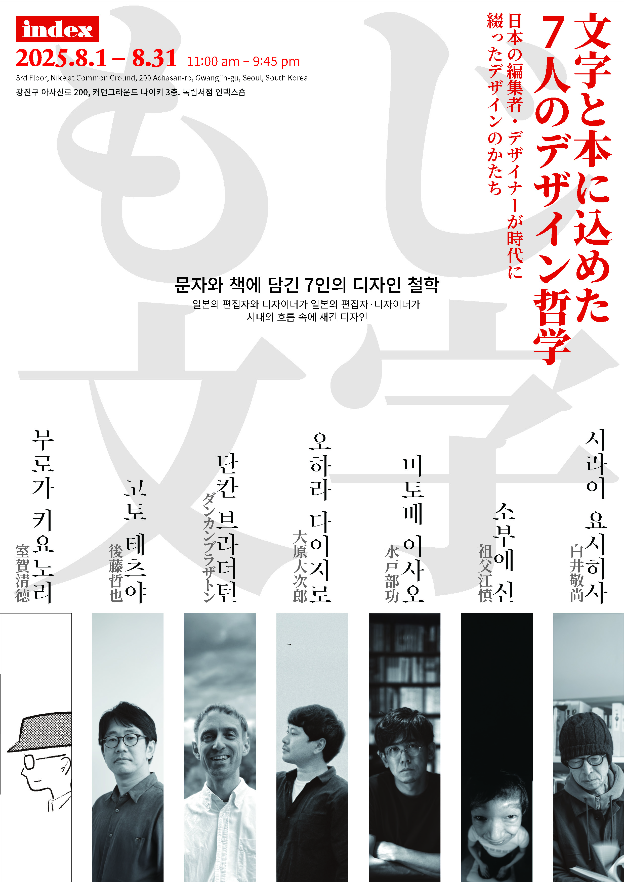 본 전시는 일본의 편집자·디자이너 7인이 직접 디자인하고 편집한 책들을 통해, 종이라는 매체 위에 구현된 사유와 사회에 대한 시선을 소개합니다. 제본, 타이포그래피, 구성, 기획 등 편집 실천이 반영된 여러 책을 통해, 편집과 디자인이 각 시대의 사상, 문화, 사회적 맥락을 어떻게 담아왔는지를 전시합니다.