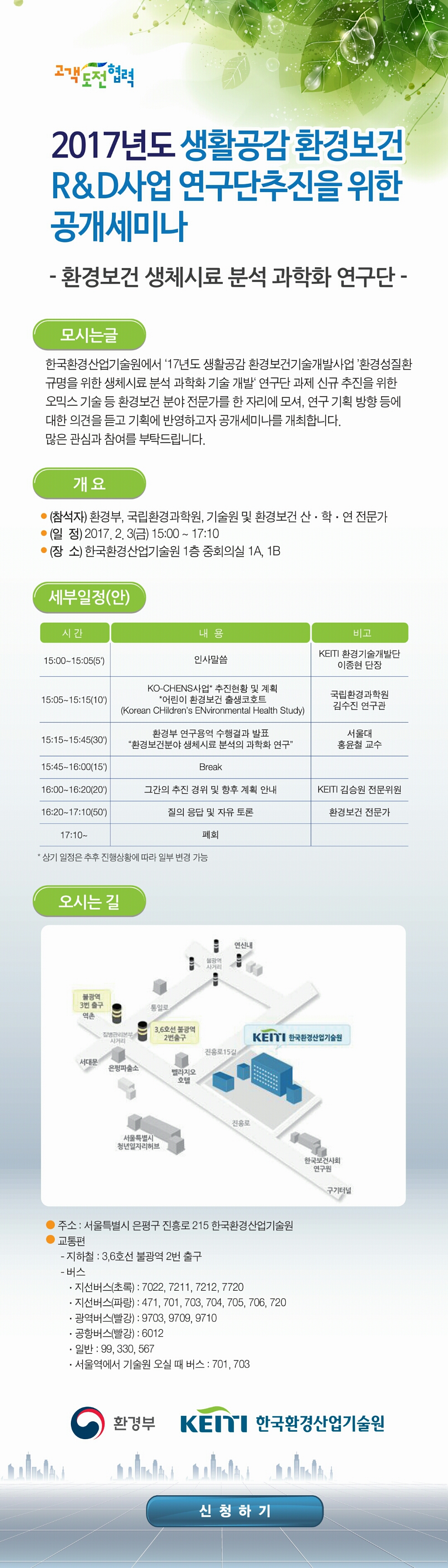 | 한국환경산업기술원에서 ‘17년도 생활공감 환경보건기술개발사업 ’환경성질환 규명을 위한 생체시료 분석 과학화 기술 개발‘ 연구단 과제 신규 추진을 위한 오믹스 기술 등 환경보건 분야 전문가를 한 자리에 모셔, 연구 기획 방향 등에 대한 의견을 듣고 기획에 반영하고자 공개세미나를 개최합니다. 많은 관심과 참여를 부탁드립니다. 참석자) 환경부, 국립환경과학원, 기술원 및 환경보건 산·학·연 전문가 (일 정) 2017. 2. 3(금) 15:00 ~ 17:10 (장 소) 한국환경산업기술원 1층 중회의실 1A, 1B |