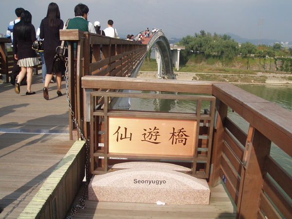 2005년 10월 9일 (일) 오후 1시부터 선유도 공원(양화대교 중간)에서 있었던 한글문화연대 주최 559돌 한글날 기념 '2005 으뜸 한글 온누리에' 행사장에 가면서 눈에 띈 선유교의 현판입니다. 앞에 보이는 아름다운 선유교의 모습과는 달리 온통 한자로 적힌 현판은 참으로 눈에 거슬렸다. 한자와 로마자만 있고 한글은 어디에도 없었습니다. <찍은 이: 꿈돌이(2005.10.9.)>