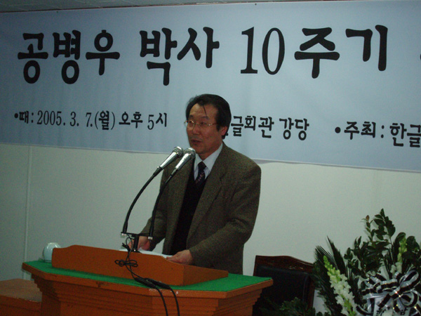 2005년 3월 7일 (월) 오후 5시에 한글 회관 강당에서 있은 공병우 박사 10주기 추모식에서 이 대로(우리말살리는겨레모임 대표) 선생님께서 공 병우 박사님의 삶과 한글사랑 운동을 펼치는 과정에서 얽힌 이야기를 하고 있는 모습입니다. (찍은 이: 꿈돌이, 20050307.)