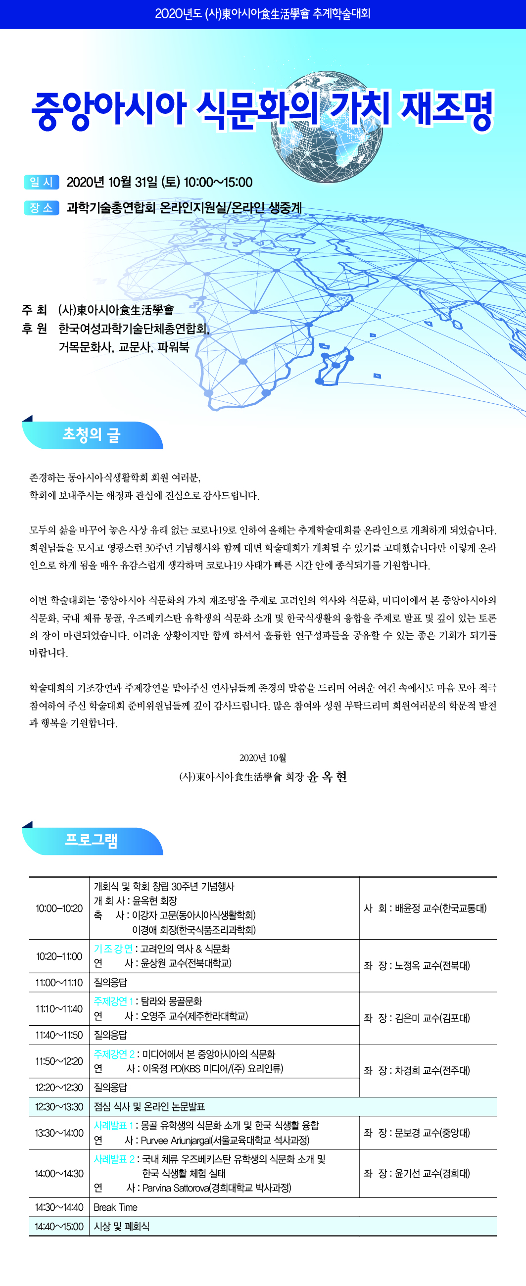 2020년도 (사)동아시아식생활학회 추계학술대회 개최 안내 (온라인/10.31.토)