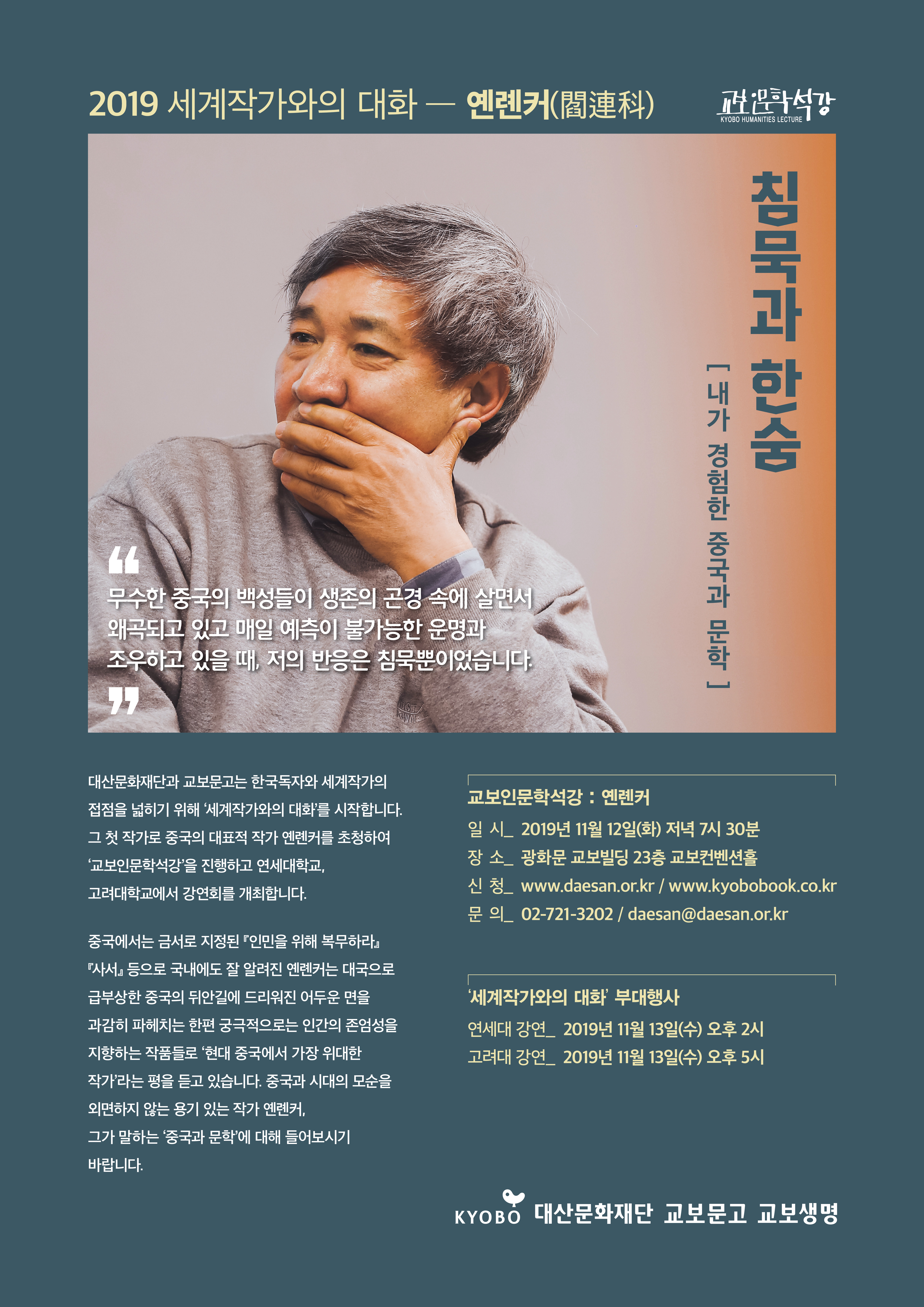 문학 관련 공익사업을 펼치고 있는 대산문화재단에서 오는 11월 12일(화) 저녁 7시 30분, 광화문 교보빌딩23층 교보컨벤션홀에서 옌롄커 작가를 초청하여 강연을 진행합니다. 이번 강연회는 350석 규모로 매회 무료참가로 진행되며, 참가 신청은 교보문고와 대산문화재단 홈페이지를 통해 하실 수 있습니다.
