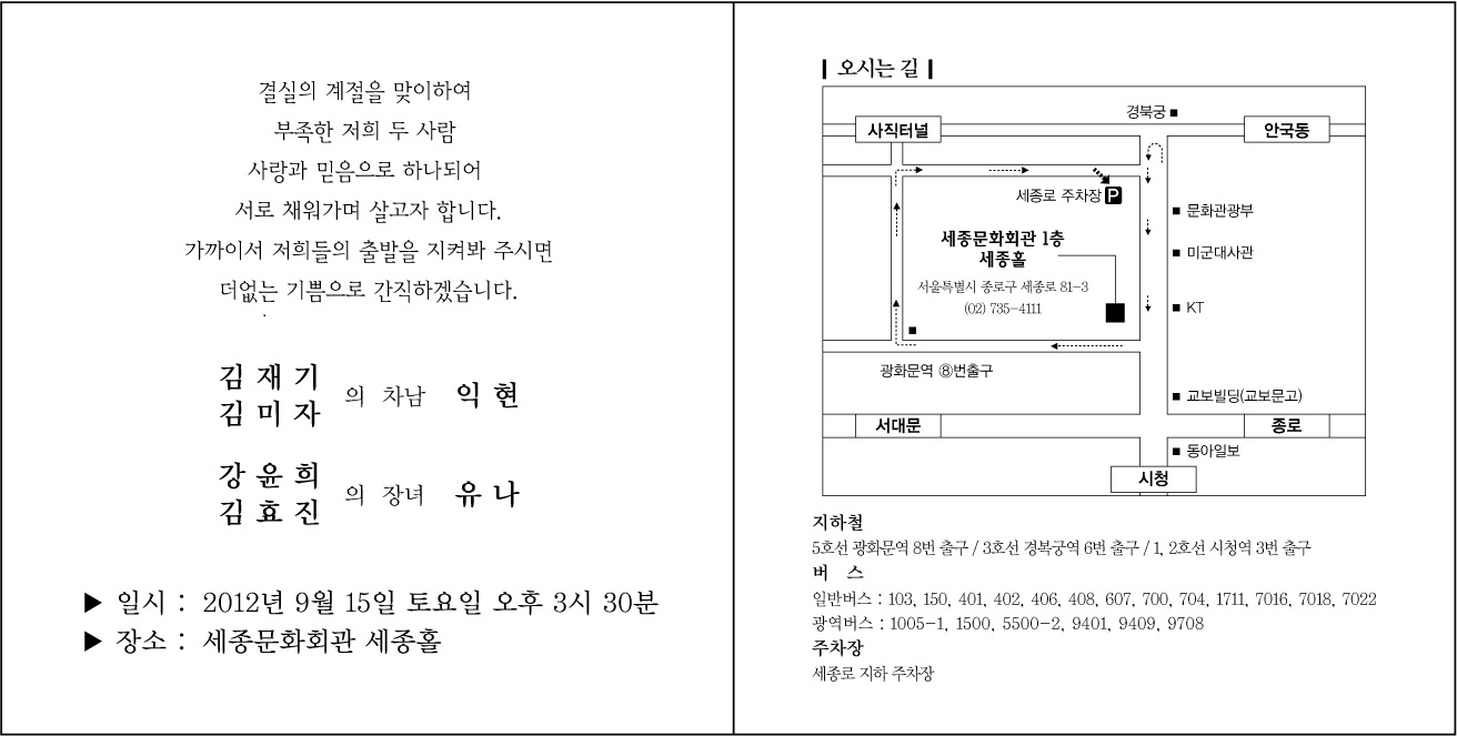 대구대학교 행정대학 김재기 교수 자녀 결혼일시: 2012.9.15(토) 오후3시30분장소: 세종문화회관 세종홀(02-735-4112)연락처: 김재기 교수(011-1761-6162)첨부: 청첩장 1부