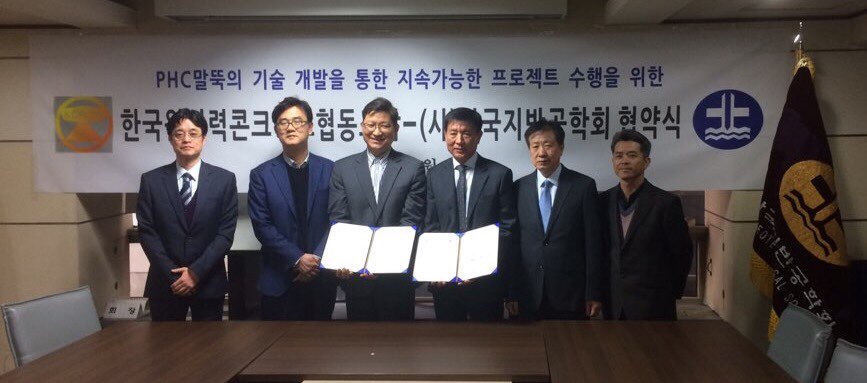 2017년 3월29일 학회와 한국원심력콘크리트공업협동조합이 상호 존중과 신뢰를 바탕으로 PHC말뚝 기술 개발 및 학술 발전을 도모하고 중소기업 상생을 위한 협력 관계를 구축하기 위하여 협약식을 체결하고 상호 협력하기로 하였습니다.