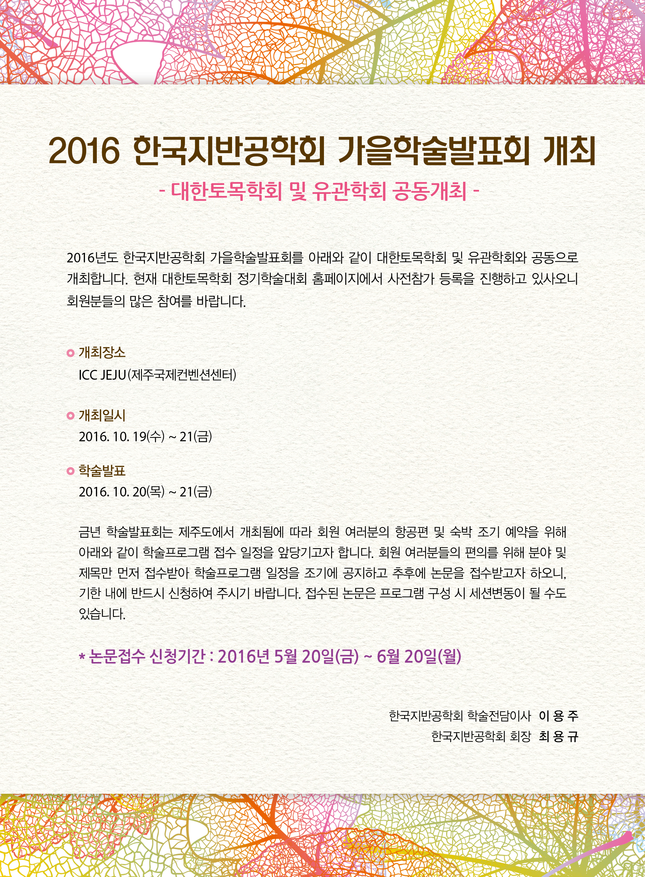 2016 가을학술발표회 논문접수 신청 및 일정안내(대한토목학회와 공동개최)