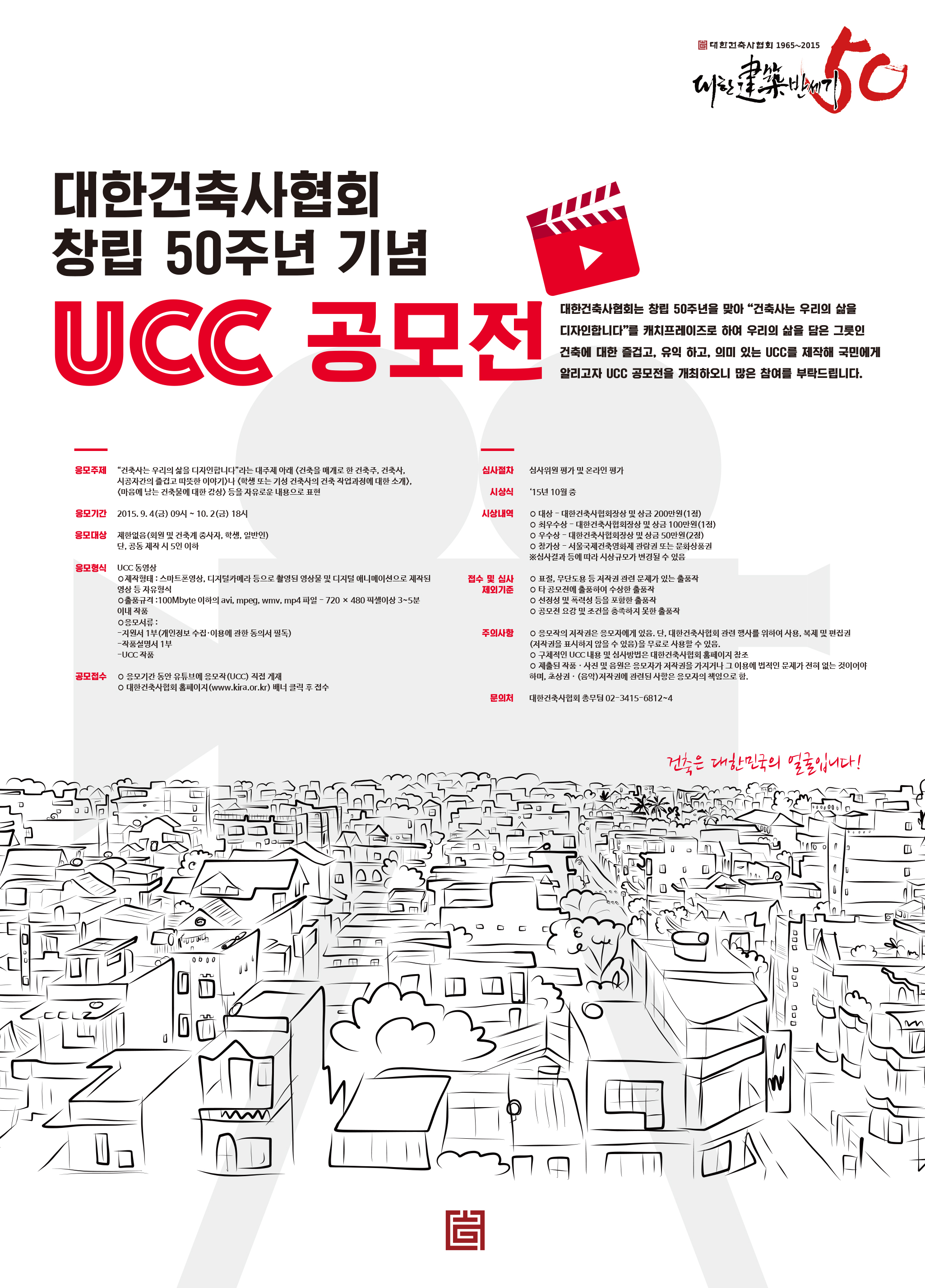 대한건축사협회는 창립 50주년을 맞아 “건축사는 우리의 삶을 디자인합니다”를 캐치프레이즈로 하여 우리의 삶을 담은 그릇인 건축에 대한 즐겁고, 유익하고, 의미 있는 UCC를 제작해 국민에게 알리고자 UCC 공모전을 개최하오니 많은 참여를 부탁드립니다.
