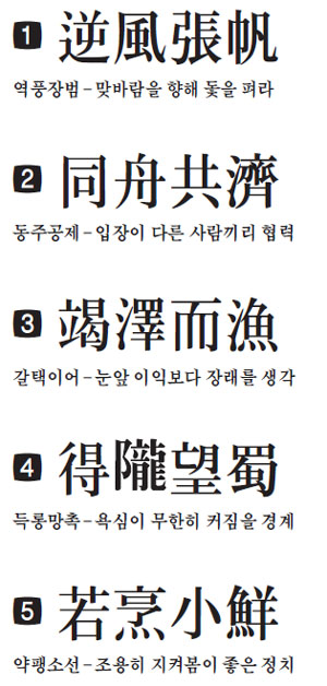 신성장동력 발굴을 통해 질 좋은 일자리를 창출하라는 제언은 `맞바람을 향해 돛을 펴야 항해할 수 있다`는 의미인 역풍장범(逆風張帆), 공정거래질서 확립과 중소기업 육성은 `처지가 다른 사람들끼리도 협력해야 한다`는 뜻을 담은 동주공제(同舟共濟), 저출산과 노동시장 양극화 문제 해소는 `눈앞의 이익에 급급해 먼 장래를 잊지 말라`는 경고 메시지를 뜻하는 갈택이어(竭澤而漁), 보편적 복지보다 선택적 복지라는 어젠더는 `사람 욕심이 무한히 확대되는 것을 경계하라`는 뜻인 득롱망촉(得望蜀), 경제 성장을 저해하는 기업 규제 완화는 `생선을 삶을 때 너무 많이 뒤집는 것을 삼가라`는 노자의 경구 약팽소선(若烹小鮮)을 각각 제시했다.