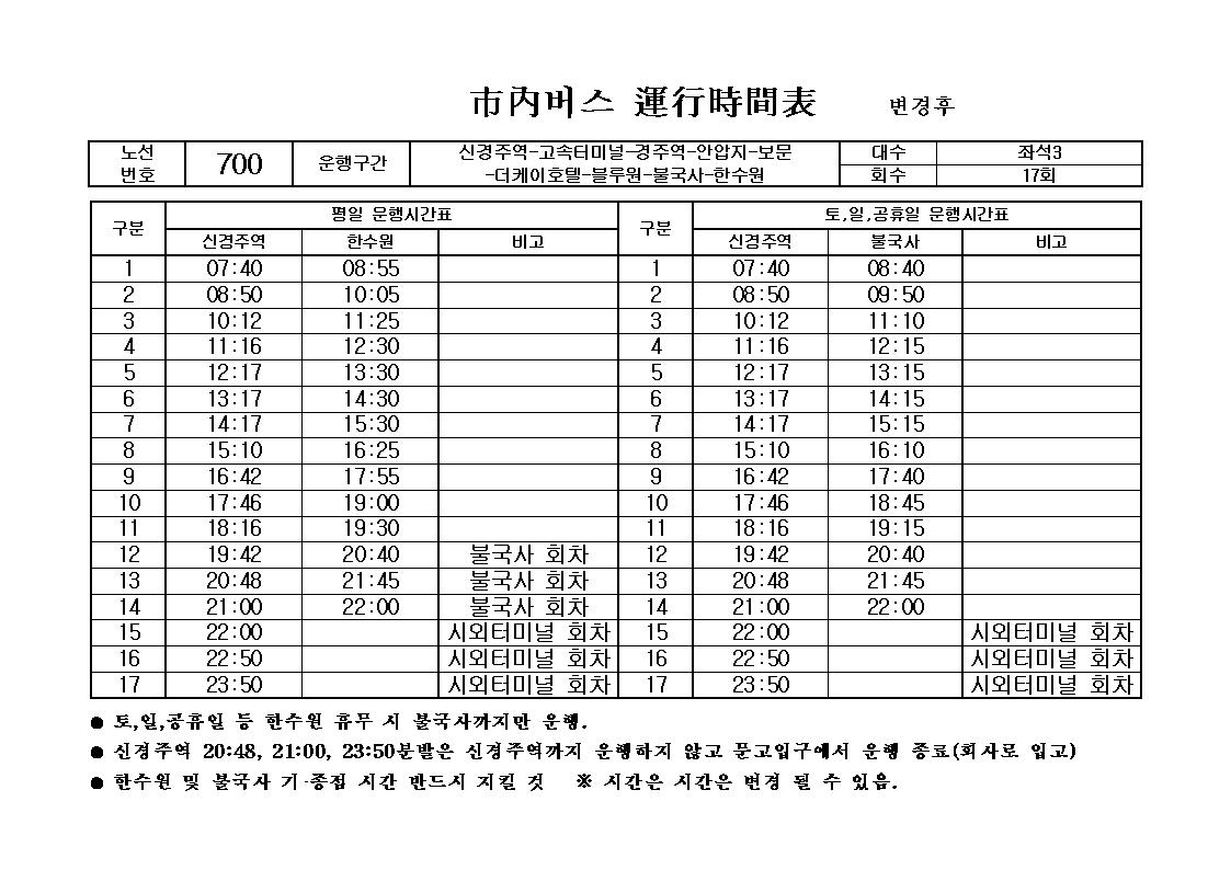 ※ 700번 버스 시간표는 첨부파일을 참조하여 주시기 바랍니다.