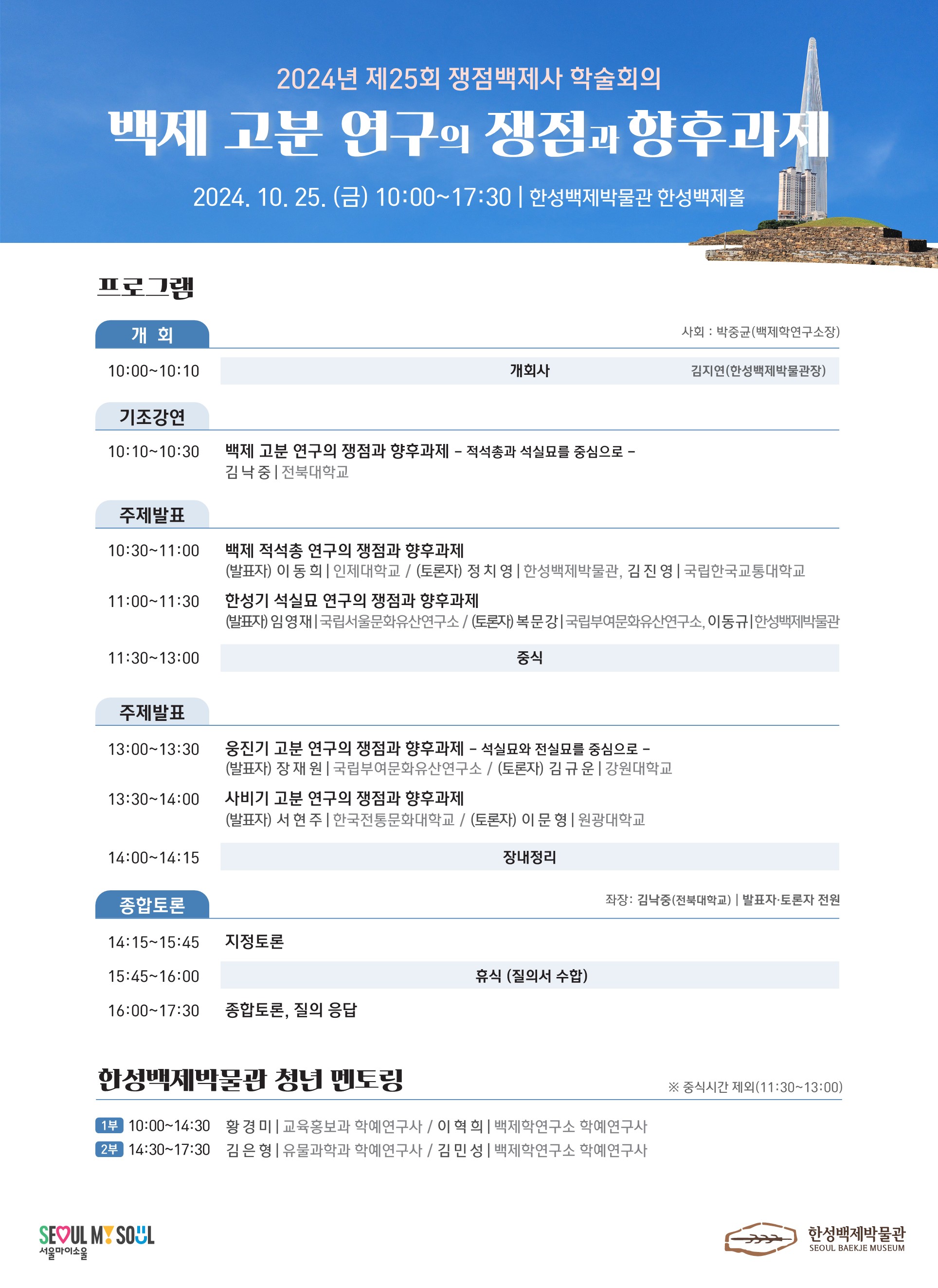 한성백제박물관 백제학연구소는 백제 고고·역사의 중요 현안과 쟁점 사안을 주제로 선정하여 집중 토론하는 <쟁점백제사 학술회의>를 매년 두차례 개최하고 있습니다이번 25회 쟁점백제사 학술회의는 백제 고분 연구의 쟁점과 향후 과제라는 주제로 개최합니다.