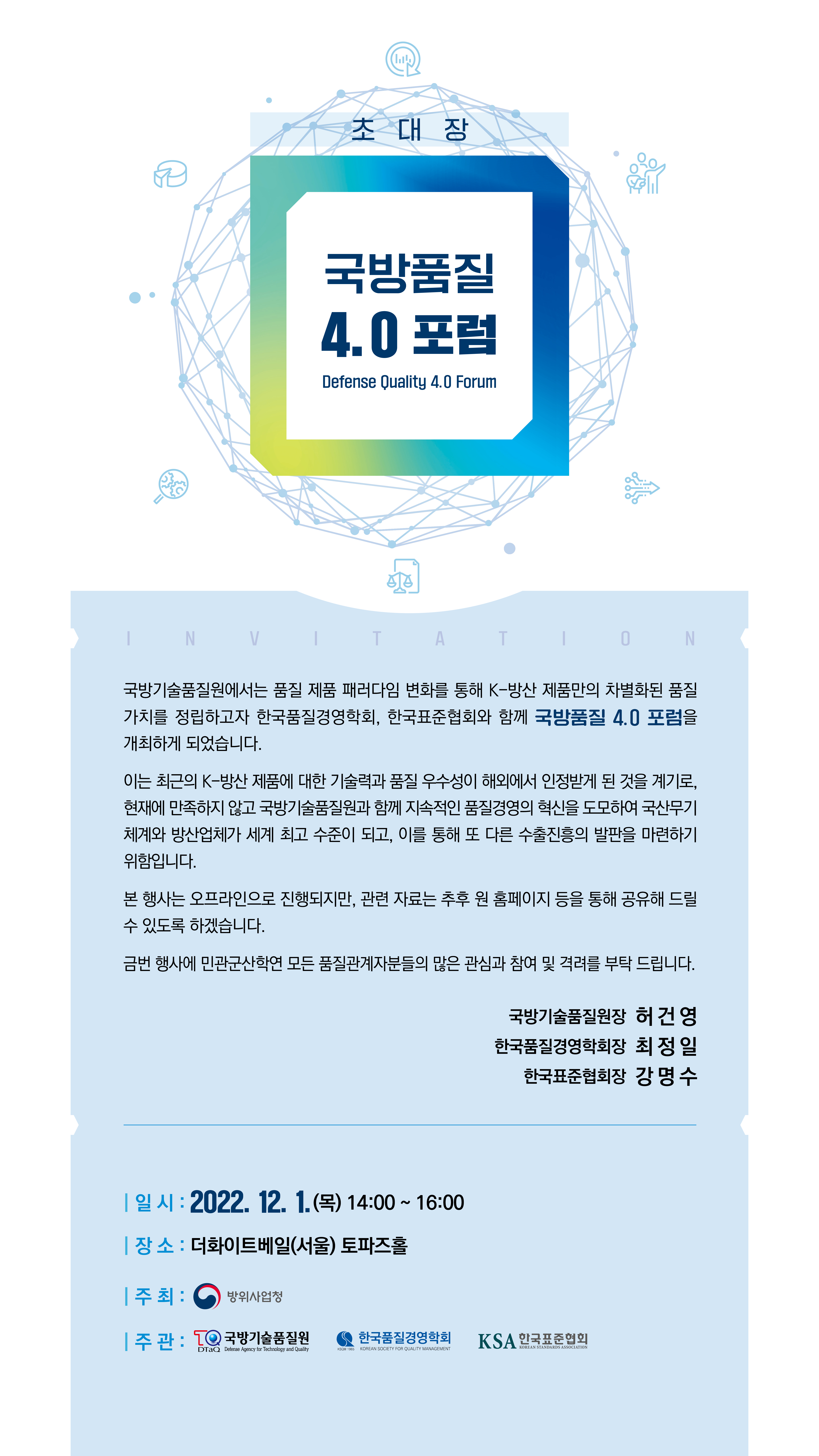 오는 12월 1일(목) 14시~16시 더화이트베일(서울)에서 국방기술품질원, 한국품질경영학회, 한국표준협회가 공동주관하는 국방품질 4.0 포럼이 개최됩니다.