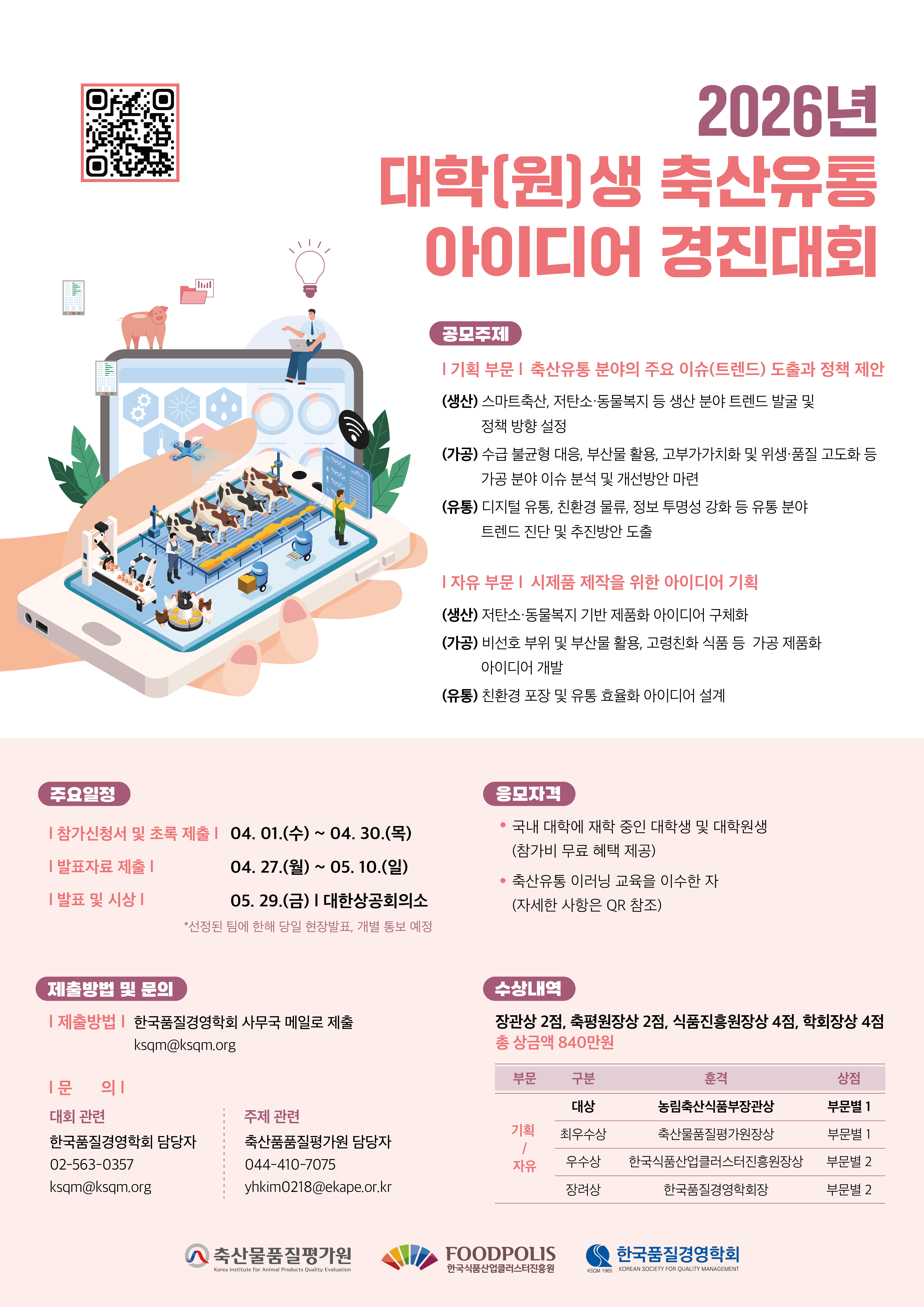 “2026년 대학(원)생 축산유통 아이디어 경진대회”를 개최하고자 하오니 많은 관심과 참여 부탁드립니다.