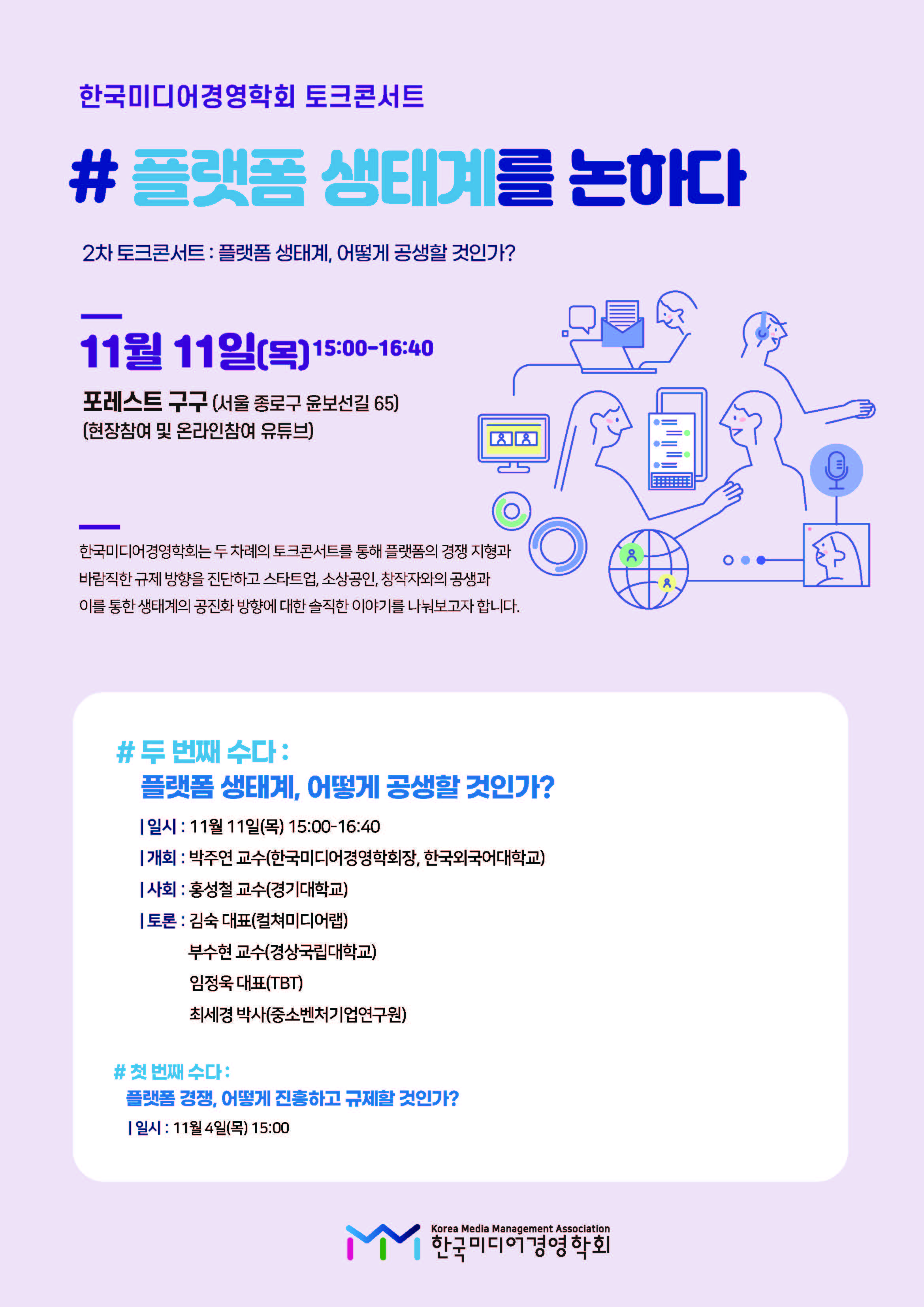 한국미디어경영학회가 두 번째 토크콘서트 '# 플랫폼 생태계를 논하다:  플랫폼 생태계, 어떻게 공생할 것인가? '  개최합니다.