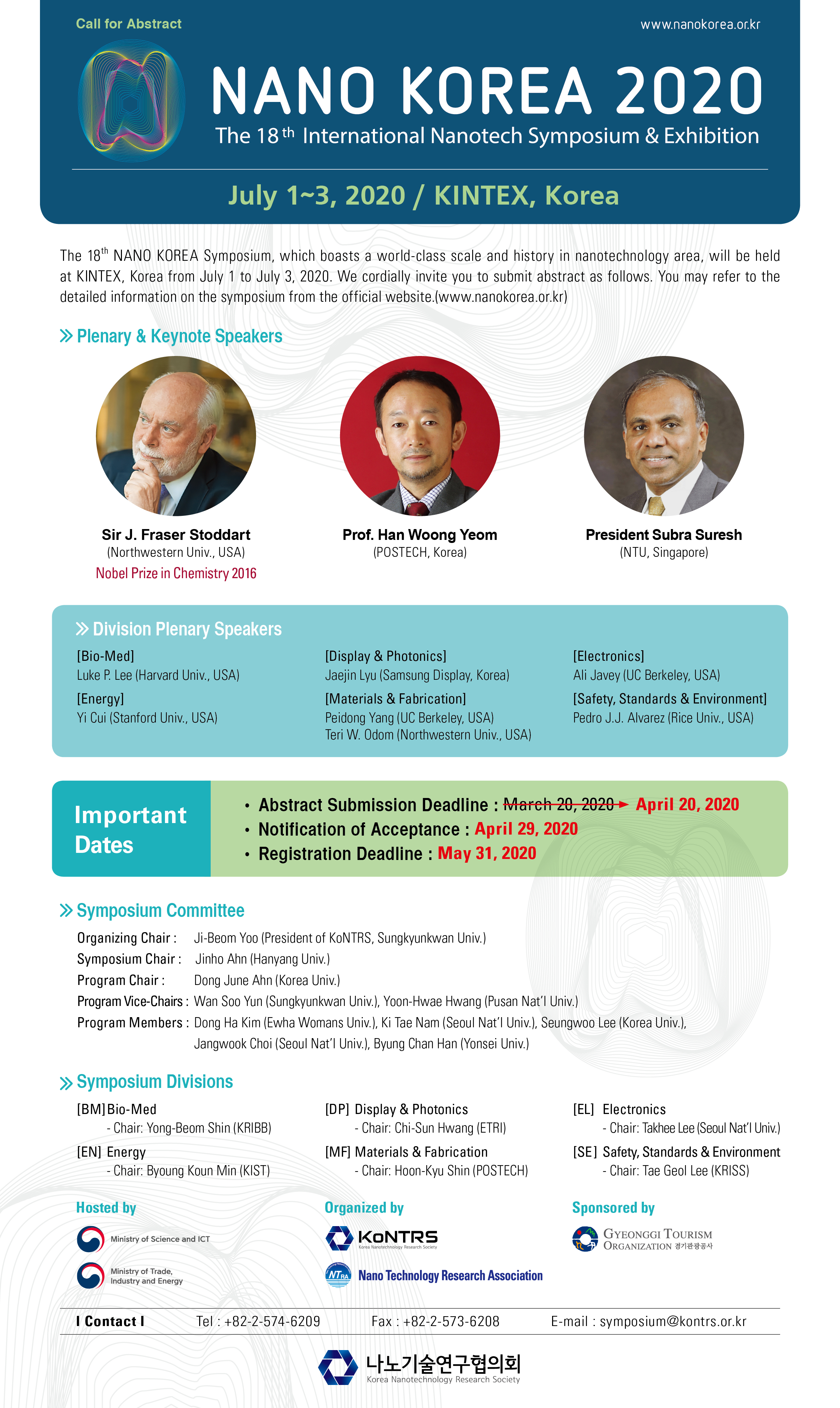 제18회 국제 나노기술 심포지엄(나노코리아 2020)202071()부터 3()까지 경기도 고양시 킨텍스(KINTEX)에서 개최됩니다.