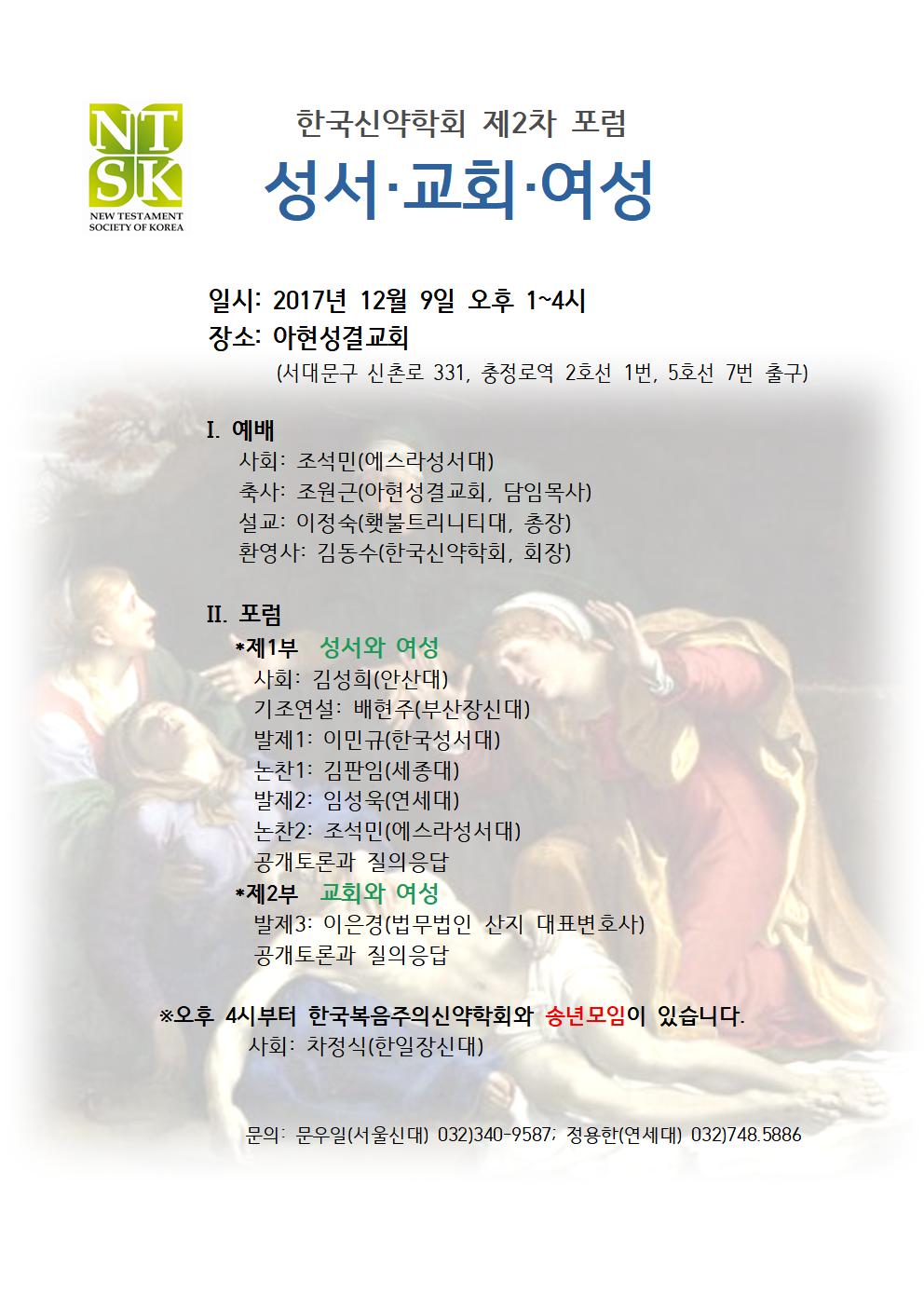 | I. 한국신약학회 제2차 포럼 <성서 교회 여성> (13:00-16:00) 일시: 2017년 12월 9일 장소: 아현성결교회 2층 모리아성전 (서대문구 신촌로 331, 지하철 충정로역 2호선 1번 출구 5호선 7번 출구) http://www.ahyun.or.kr/01_05.php 주차는 1층 야외주차장에 해주십시오. 1. 예배(총 20분) 사회: 조석민(에스라성경대 교수, 2분) 반주: 국지인(서울신대) 축사: 조원근(아현성결교회 담임목사, 8분) 설교: 이정숙(횃불트리니티대 총장, 8분) 환영사: 김동수(신약학회 회장, 평택대, 2분) #특송: 최영실(성공회대 명예교수, 3분) 2. 포럼 <성서 교회 여성>(총 153분) *제1부 성서와 여성 사회: 김성희(안산대 2분) 기조연설: 배현주(부산장신대 15분) 논문발표: 이민규(한국성서대 20분), 임성욱(연세대, 20분) 논찬: 조석민(에스라성서대, 10분), 김충연(감신대, 10분) 공개토론(20분): 이정숙, 이은경, 김판임, 조석민, 배현주, 임성욱, 이민규 질의응답(16분) *제2부 교회와 여성 발제: 이은경 (법무법인 산지 대표변호사, 20분) 질의응답(총 20분) 짧은 휴식과 인사 II. 한국복음주의신약학회와의 공동 송년모임과 만찬(16:00-19:00) *송년모임(16:00-17:30), 아현성결교회 2층 모리아성전 -사회: 차정식(한일장신대) -반주: 국지인(서울신대) *만찬(18:00-19:00), 아현성결교회 본당 옆건물 학사식당 |