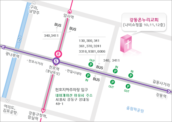교통: 지하철 5호선 및 8호선 천호역 5번 출구(도보 3분 거리)