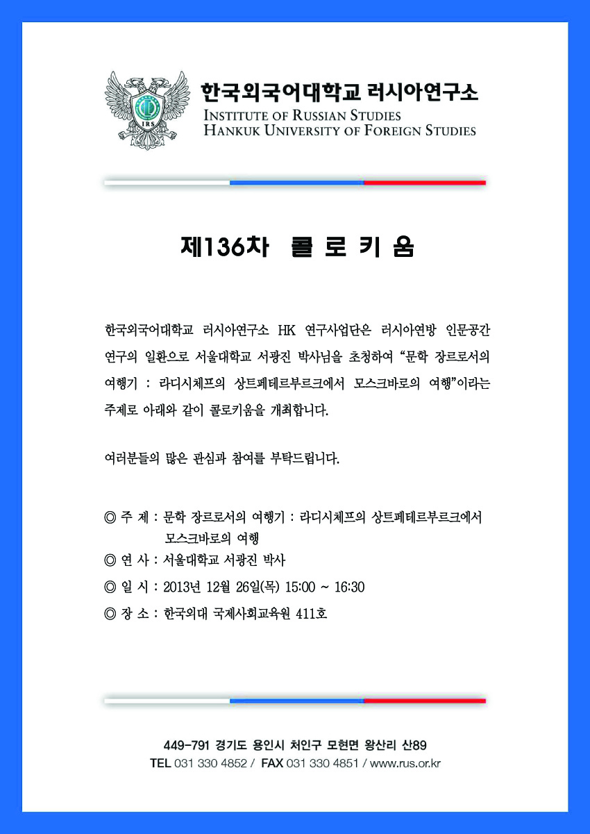 제136차 콜로키움 문학 장르로서의 여행기 : 라디시체프의 상트페테르부르크에서 모스크바로의 여행
