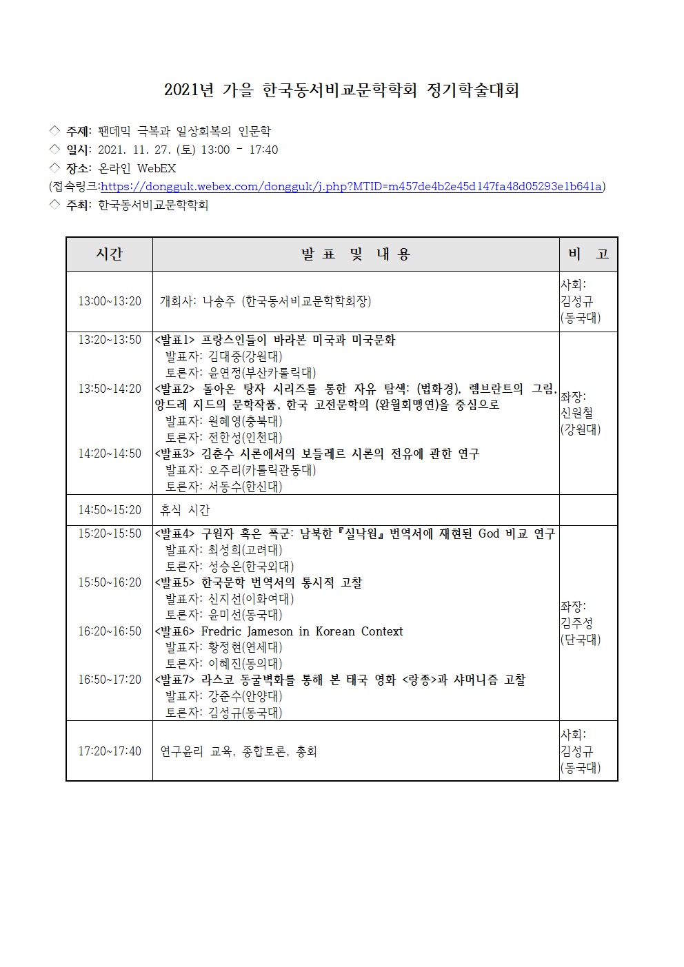 다가오는 11월 27일(토)에 있을 우리 한국동서비교문학학회의 가을 정기 학술대회 참여를 부탁드리며, 리마인드 공지를 합니다.