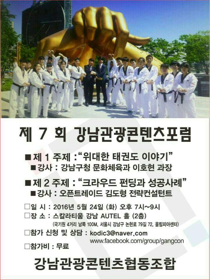 안녕하세요? 항상 행복하시고 평안하시기 바랍니다. 제 7 회 강남관광콘텐츠포럼 ‘위대한 태권도 이야기’주제로 강남구청 이호현 문화체육과장님을 모시고 진행됩니다. 오픈트레이드 김도형 전략 컨설턴트를 모시고 크라우드펀딩 주제 발표를 통해 강남 관광콘텐츠 사업화의 기회를 모색해 보는 이번 포럼에 함께 해 주시기 바랍니다. ^^ 일시 : 5월 24일 (화) 오후 7시~9시, 장소 : 스칼라티움 강남 AUTEL홀 (2층) 참가 및 신청 상담 : kodic3@naver.com www.facebook.com/group/gangcon 참가비 : 무료