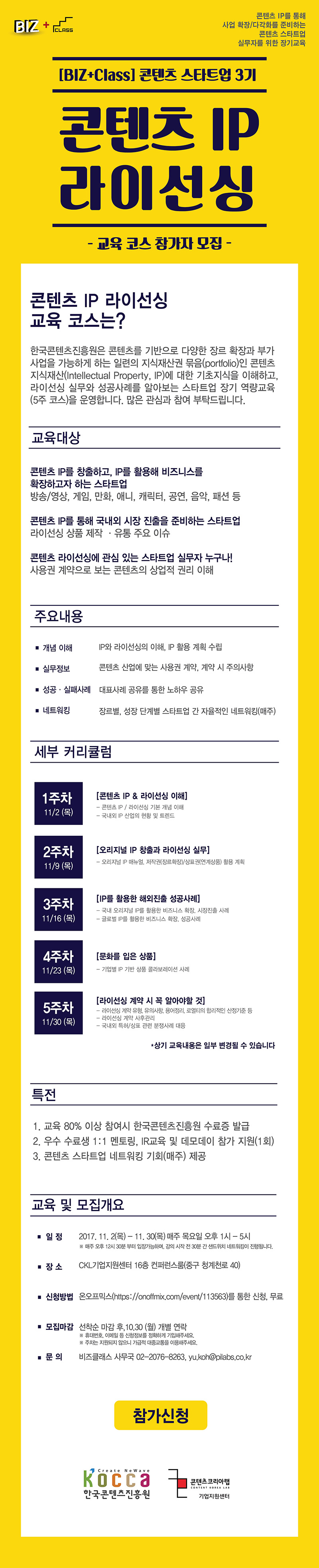 <BIZ+Class 3기 IP 라이선싱 코스>는 최근 콘텐츠 업계에서 중요한 이슈인 IP 활용방안에 대한 실무정보와 다양한 사례발표를 통해 업체들의 생생한 노하우를 공유하기 위해 마련했습니다. 웹툰, 게임, 캐릭터 등 분야의 연사진 구성중에 있습니다.