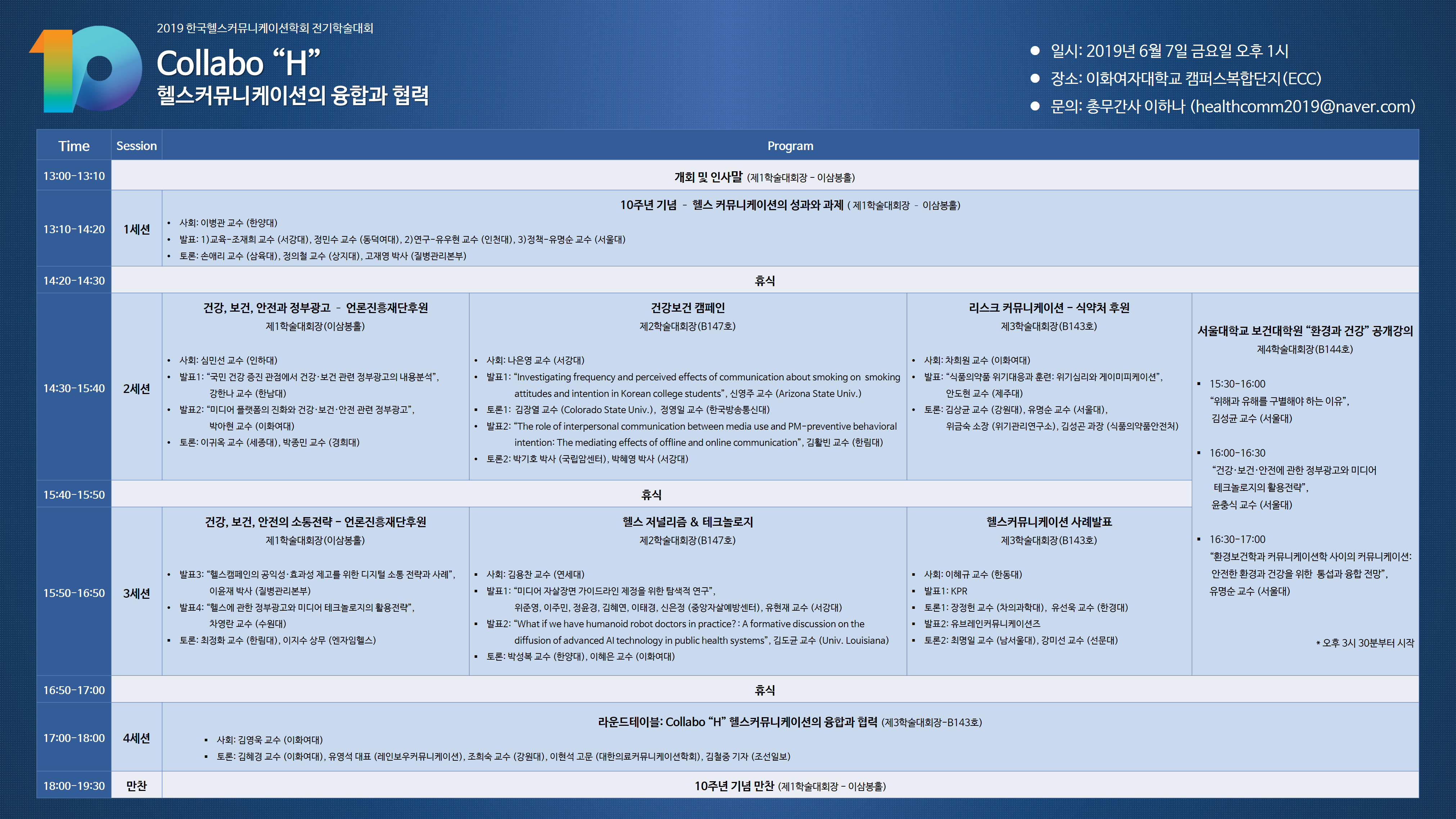 한국헬스커뮤니케이션학회에서 오는 6월 7(금) 이화여자대학교 캠퍼스복합단지(ECC)에서 창립 10주년 기념 학술대회를 개최합니다.