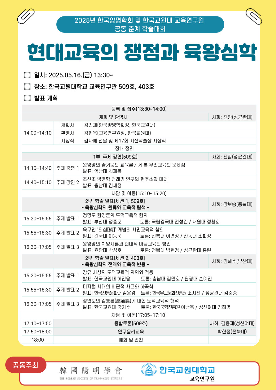 한국양명학회에서는 2025년도 춘계학술대회를 한국교원대학교 교육연구원과 공동으로 진행하고자 합니다.