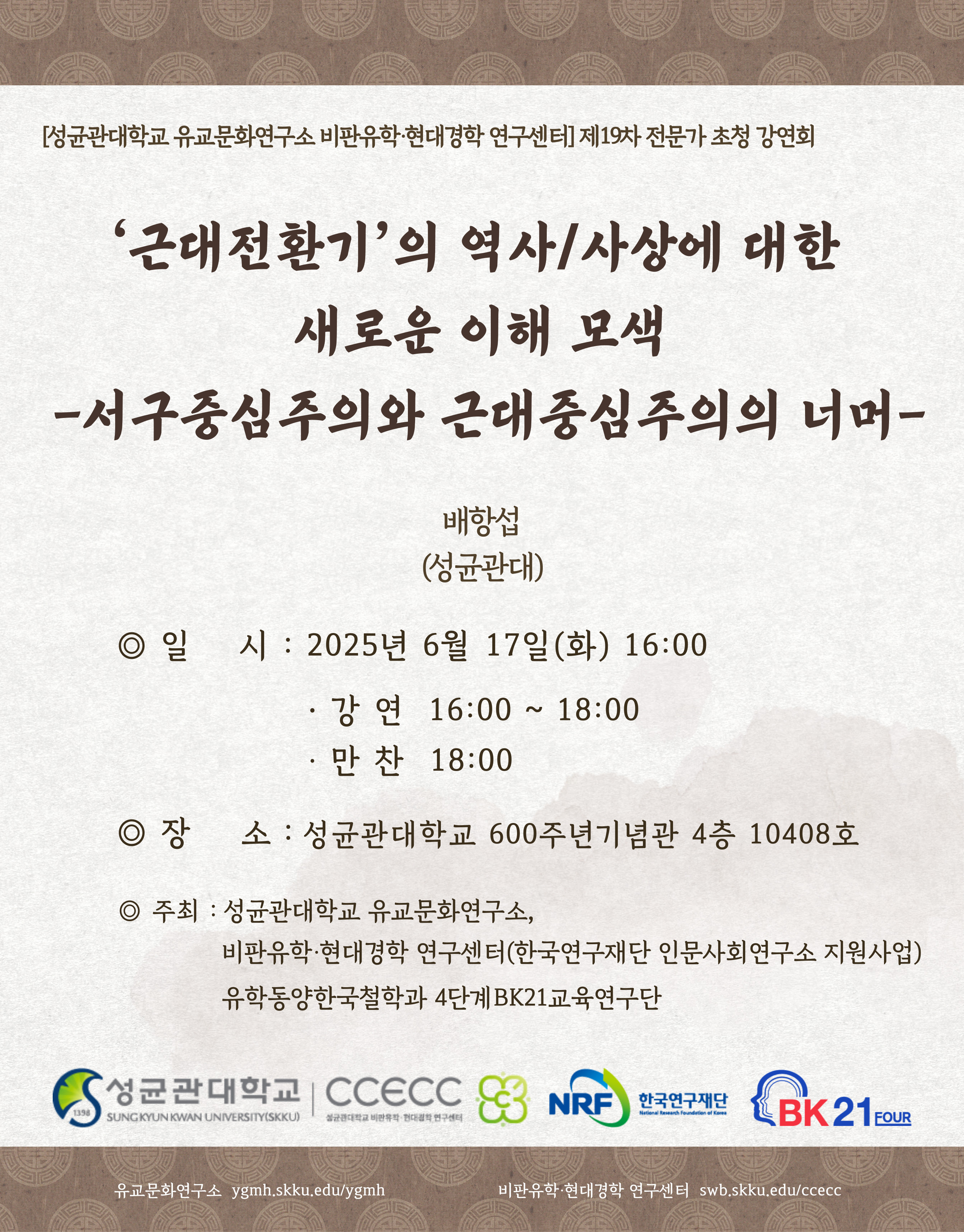 성균관대학교 유교문화연구소 비판유학 · 현대경학 연구센터와 성균관대학교 유학동양한국철학과 4단계 BK21 교육연구단은 오는 6월 17일 오후 4시부터 6시까지 제19차 전문가 초청 강연회를 개최합니다.
