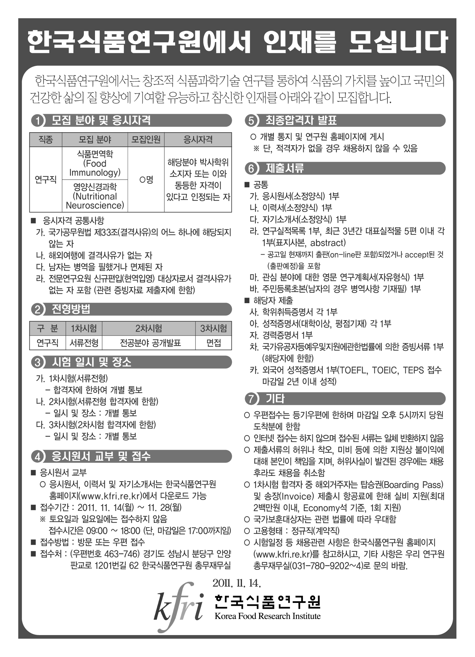 연구원에서는 21C 식품연구분야를 선도할 유능하고 참신한 인재를 모집하고 있습니다.