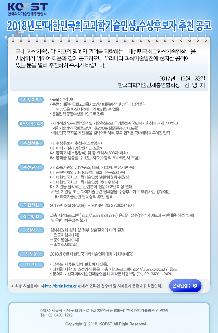 2018년도 대한민국 최고 과학기술인상 수상후보자 추천 공고